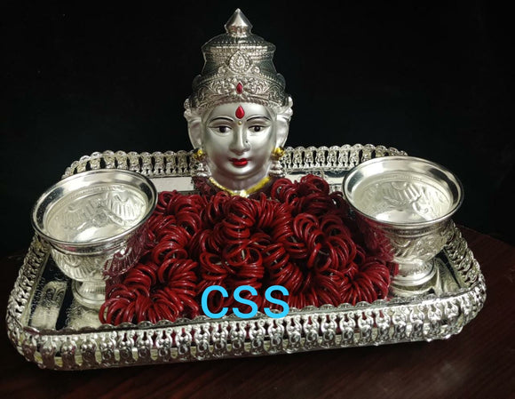 URVASHI , GERMAN SILVER TRAY WITH BOWLS , AMMAN FACE AND CHITTI BANGLES-SNGST001U