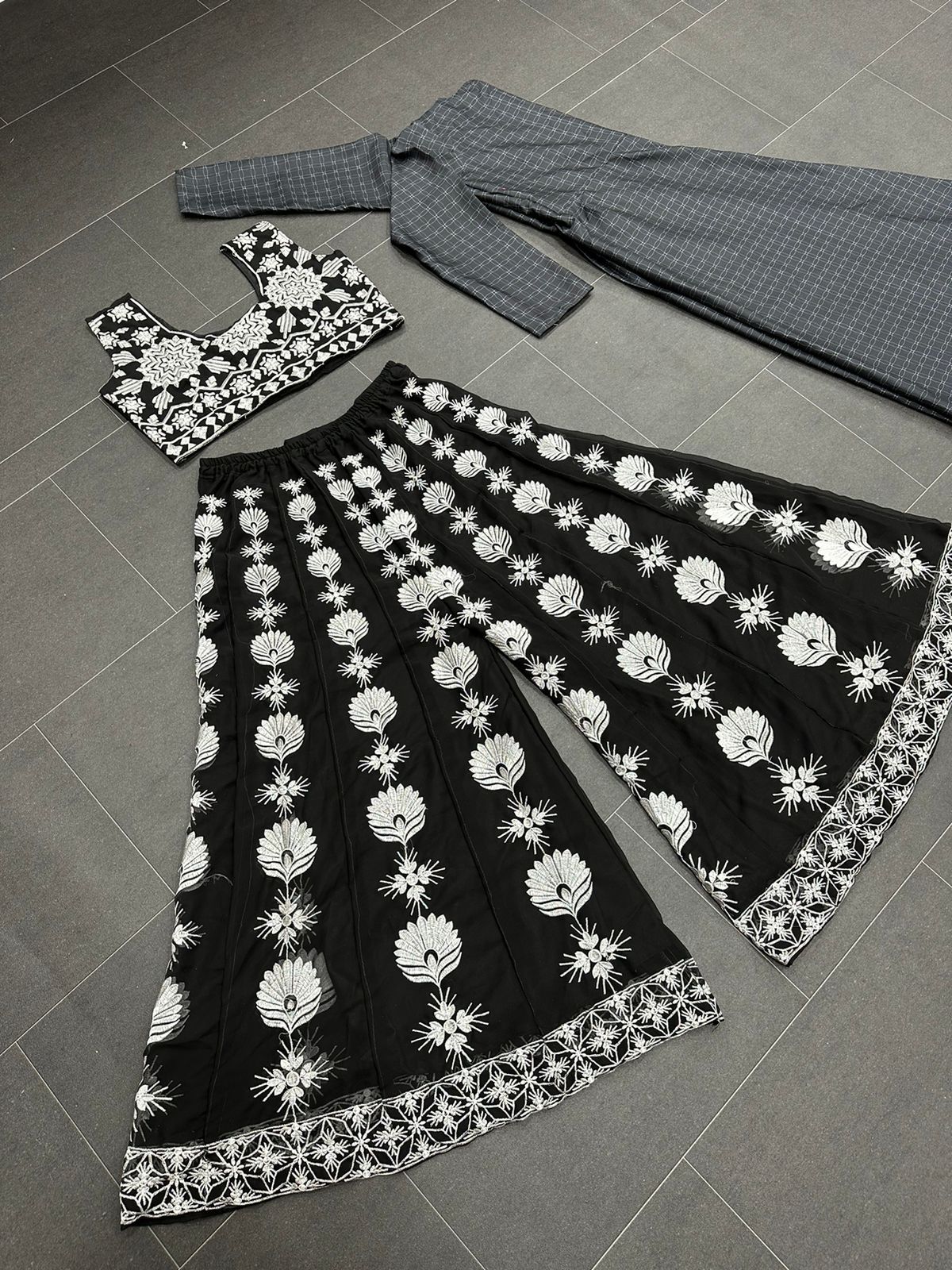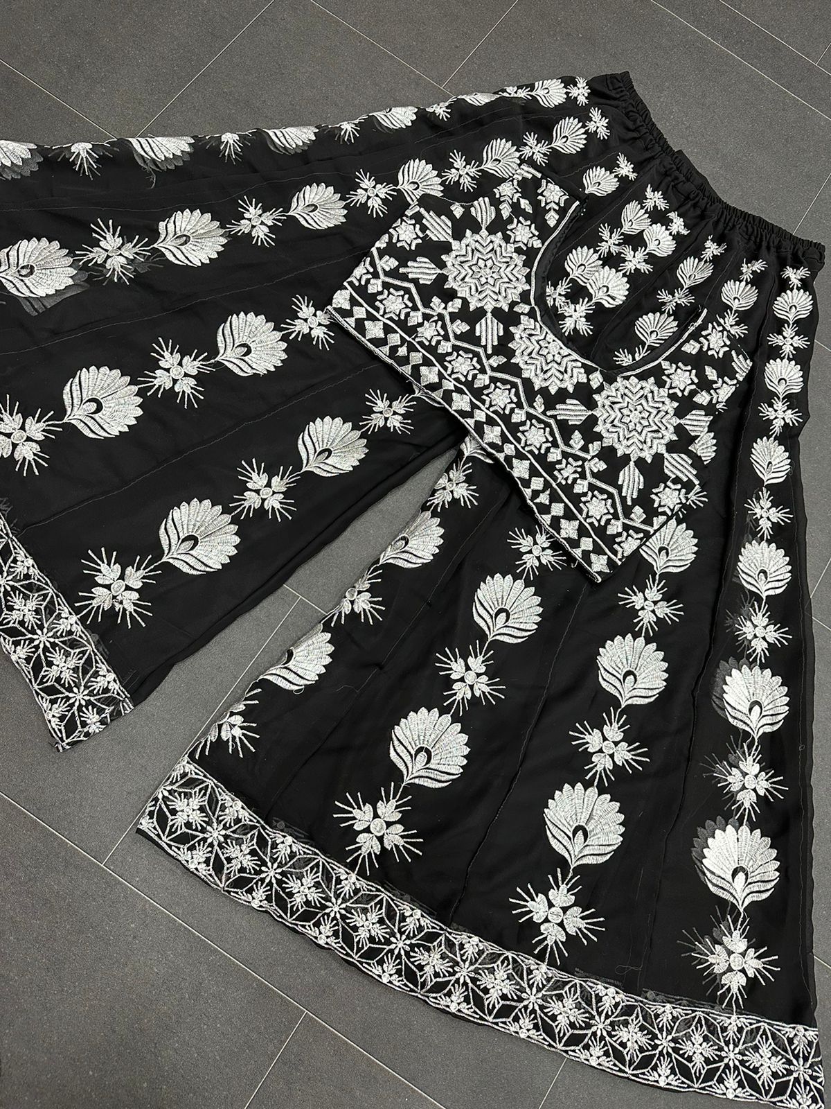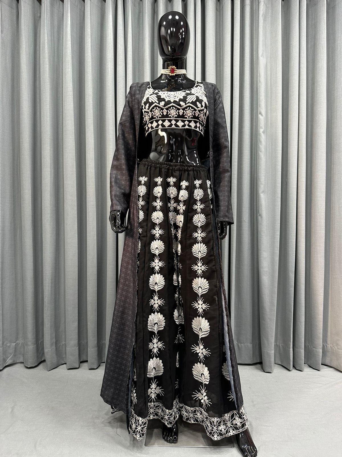 Looking for this same color beautiful Designer Palazo Set On Faux Georgette fabric with Thread work and Blouse Faux Gorgette fabric with Thread work and Shrug American Crepe with digital Print