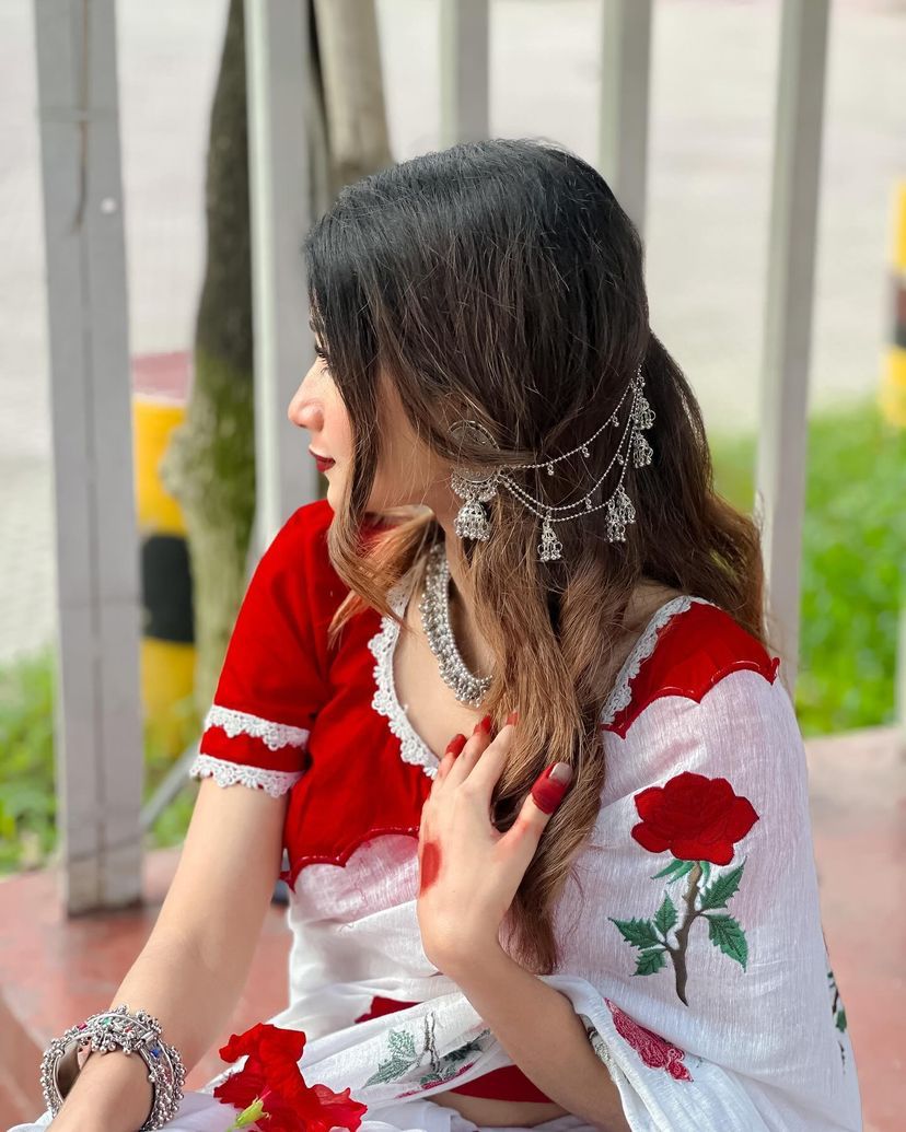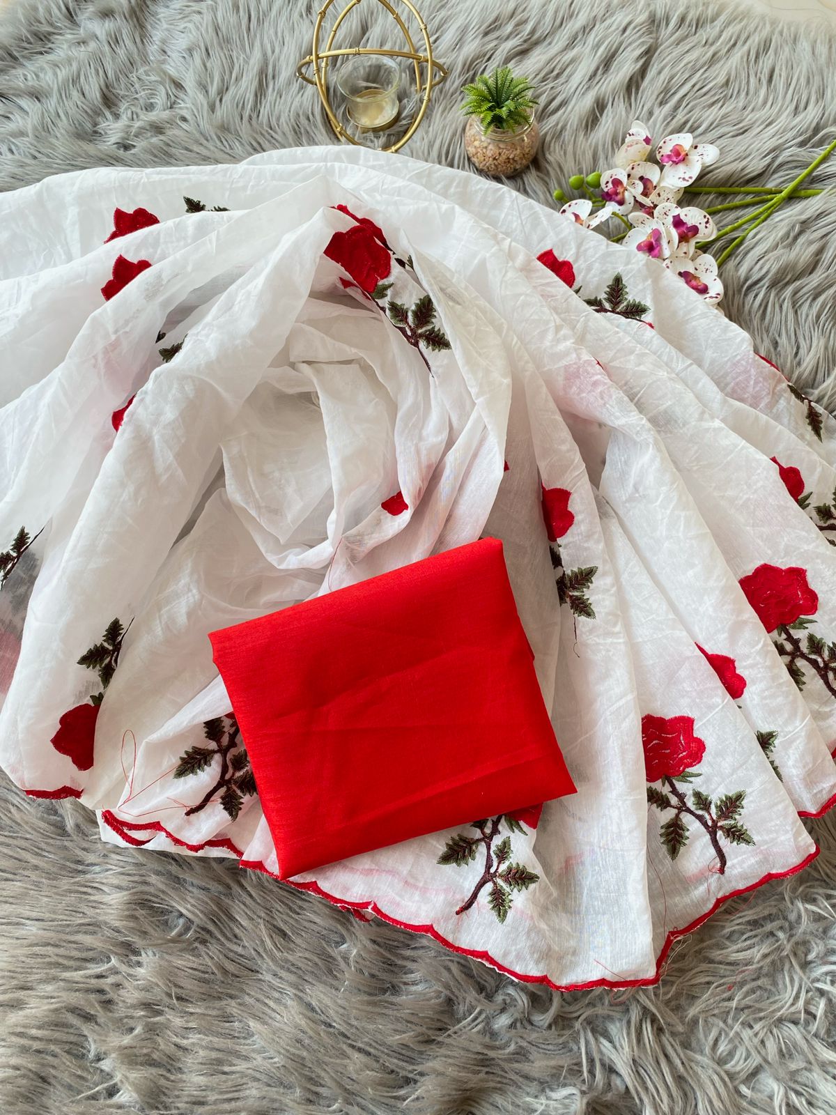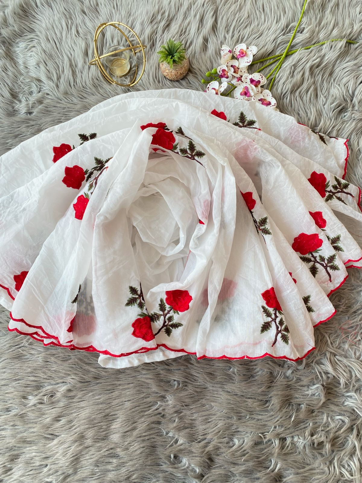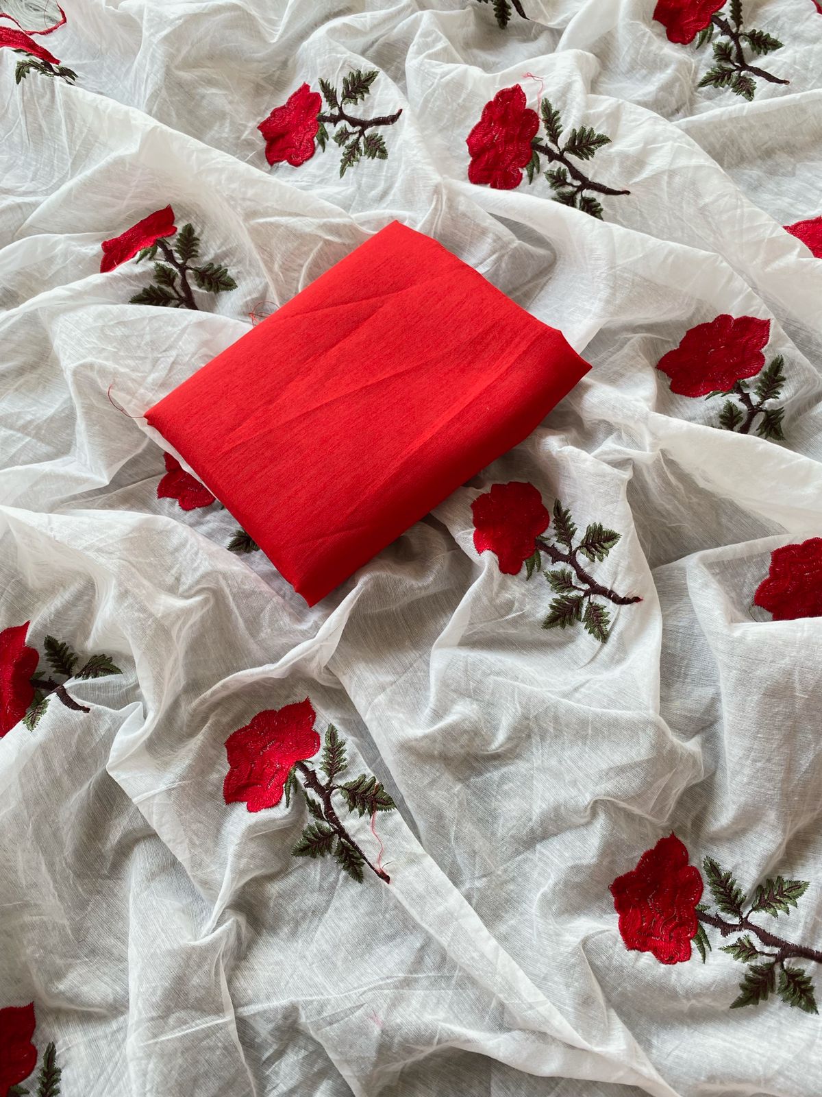 Pure Soft Chanderi Cotton With Red Rose Thread Work And Cutwork