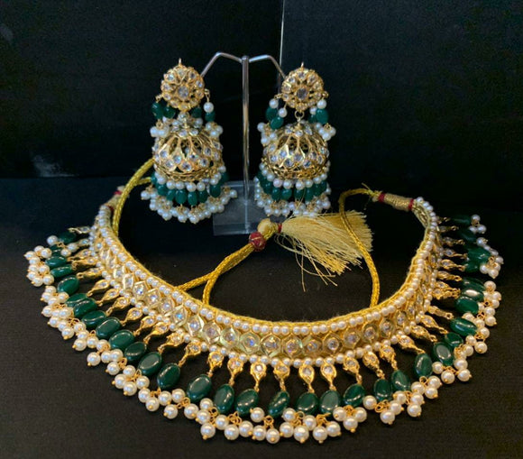 HYDERABADI JADAU KUNDAN PEARL GREEN STONES CHOKER NECKLACE SET FOR WOMEN-HYDNSG001C