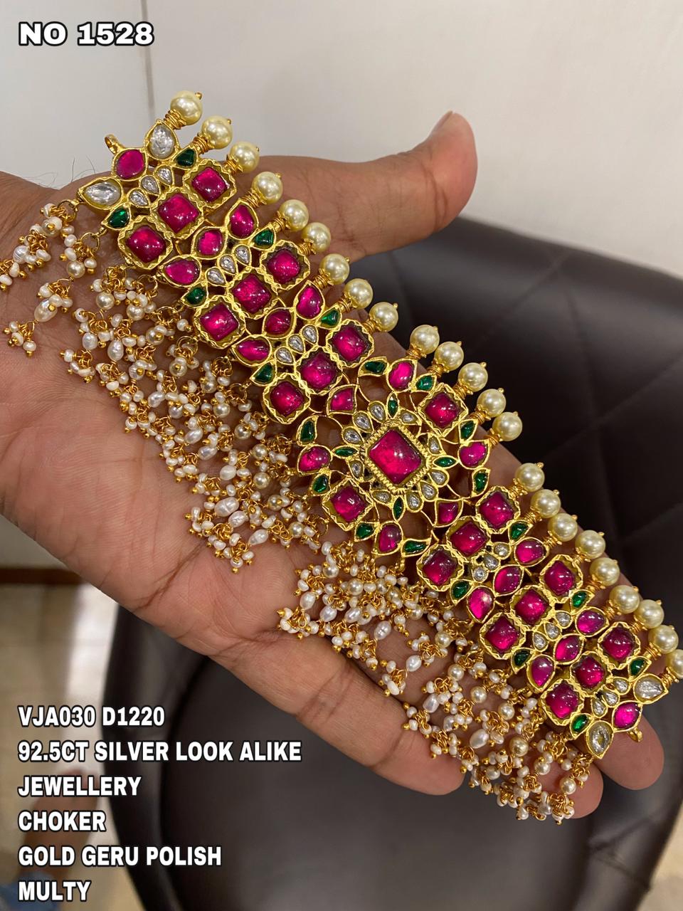 92.5 CT SILVER LOOK ALIKE MATTE GOLD GHERU FINISH KEMP PEARL CHOKER NECKLACE SET FOR WOMEN