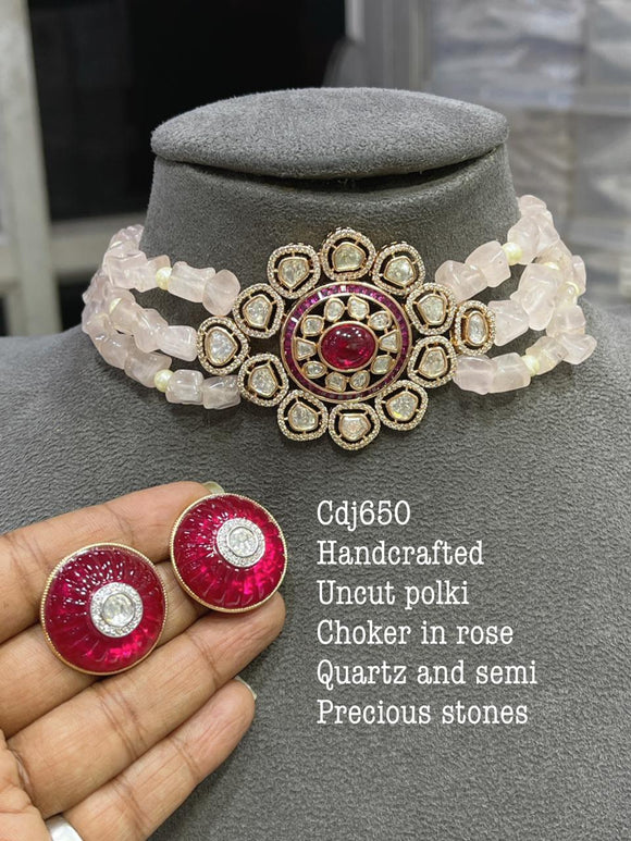 ROSA, HAND CRAFTED UNCUT POLKI CHOKER SET IN ROSE QUARTZ WITH HAND CUTTING CARVED PRECIOUS STONES-MOECS001R