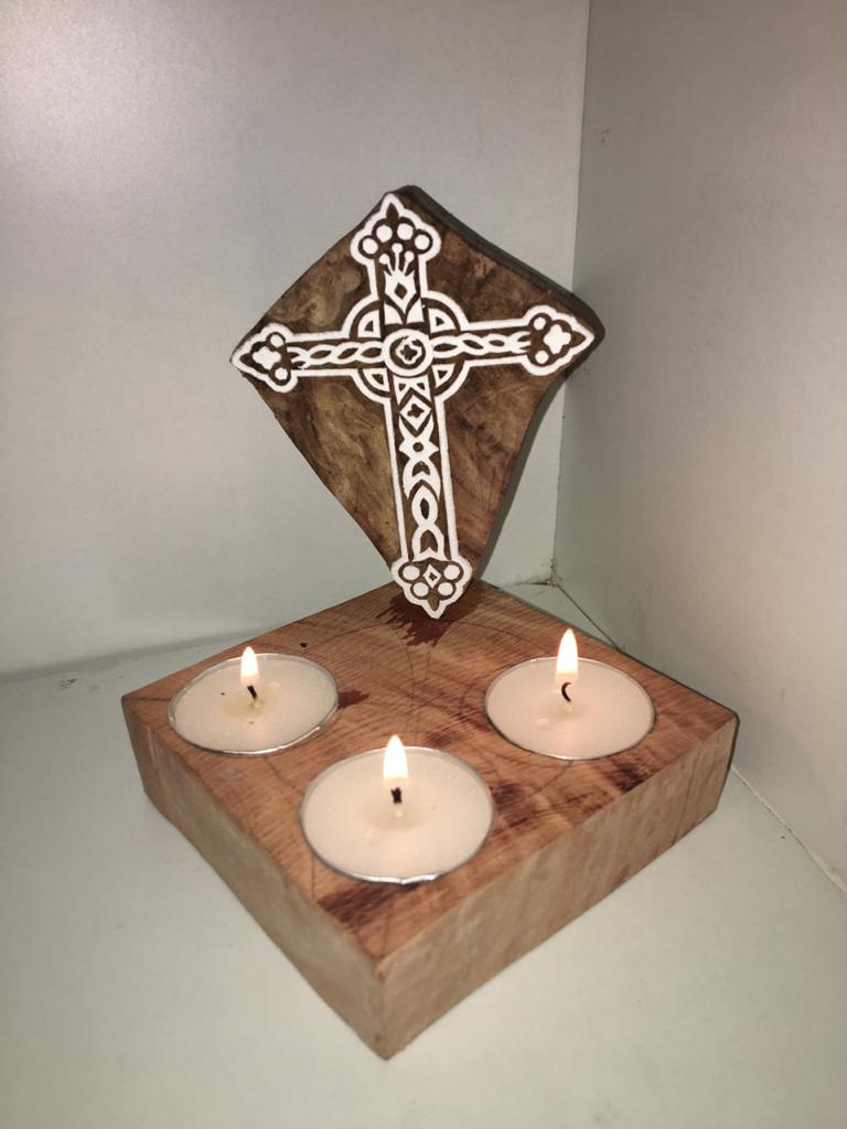HOLY CROSS DESIGN , WOODEN BLOCK PRINT CARVED CHRISTMAS SPECIAL CANDLE HOLDER WITH CANDLES-BLOC001HC