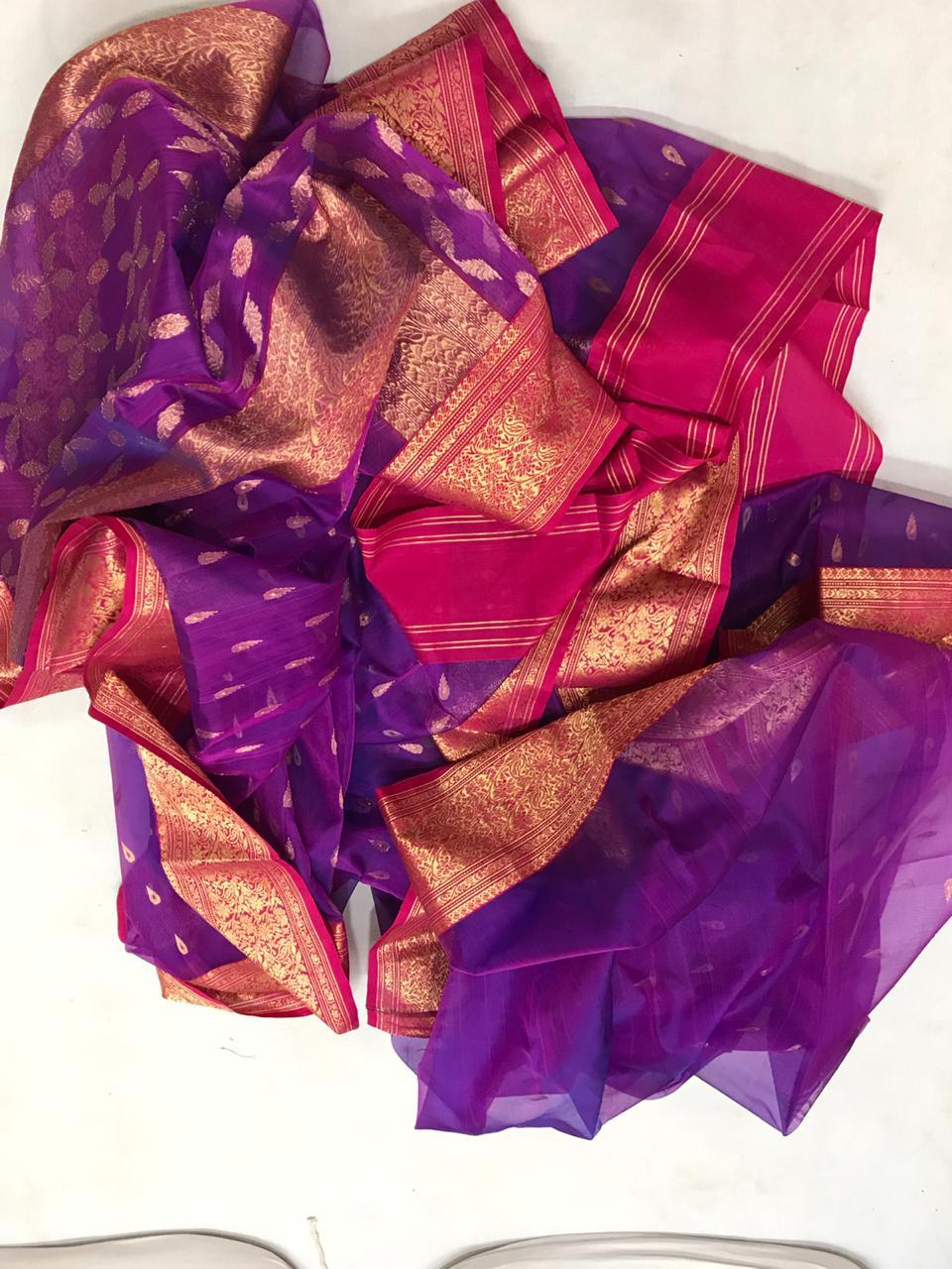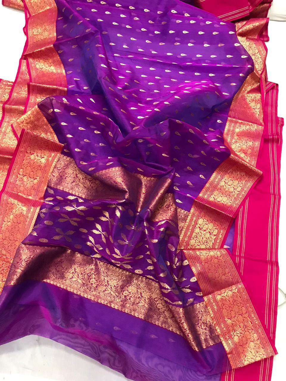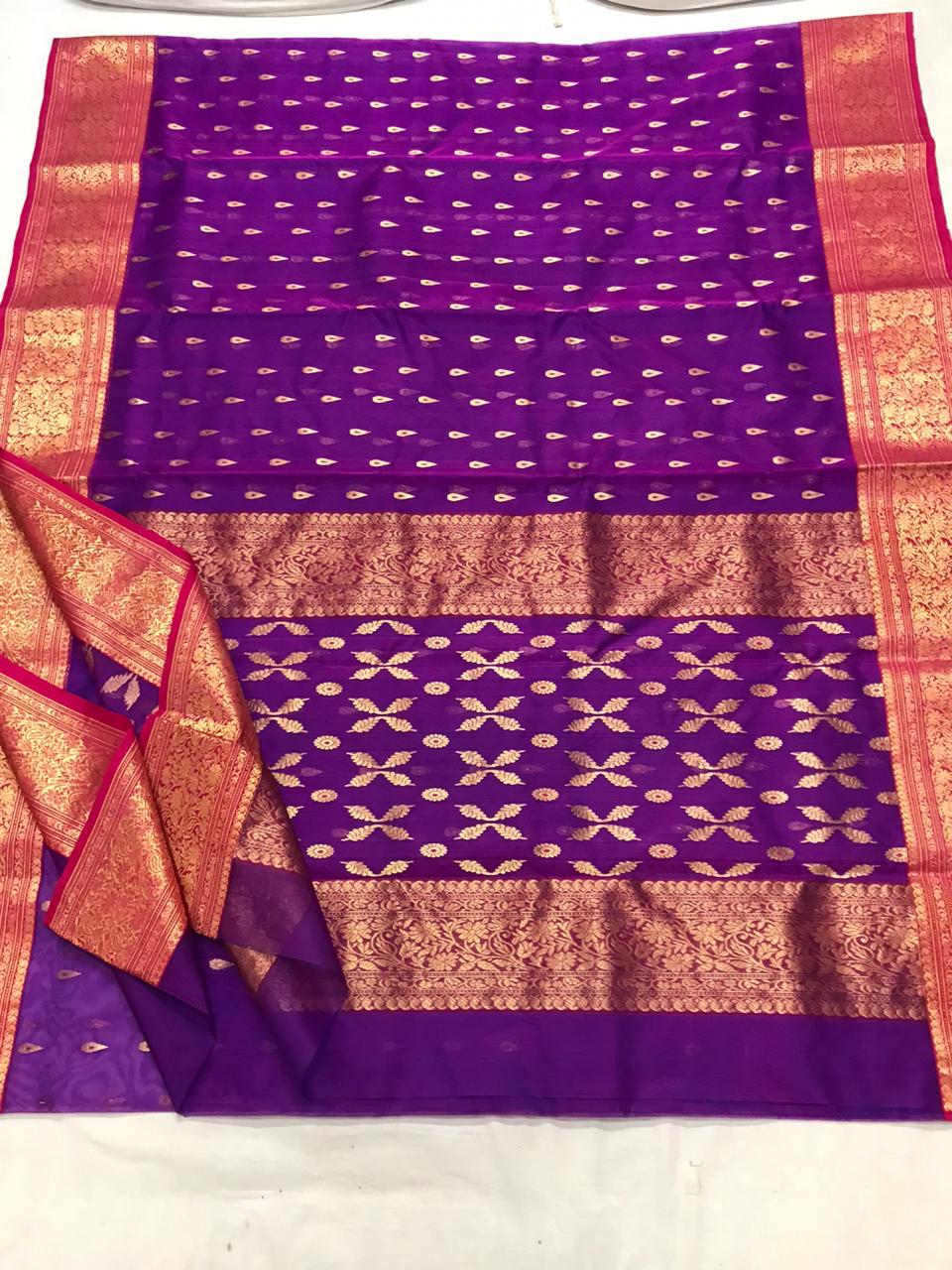 Violet color katan silk saree with magenta pink borders and pallu.The body of the saree is adorned with beautiful gold butties all over the body .The Borders are crafted with gold zari weaved designs
