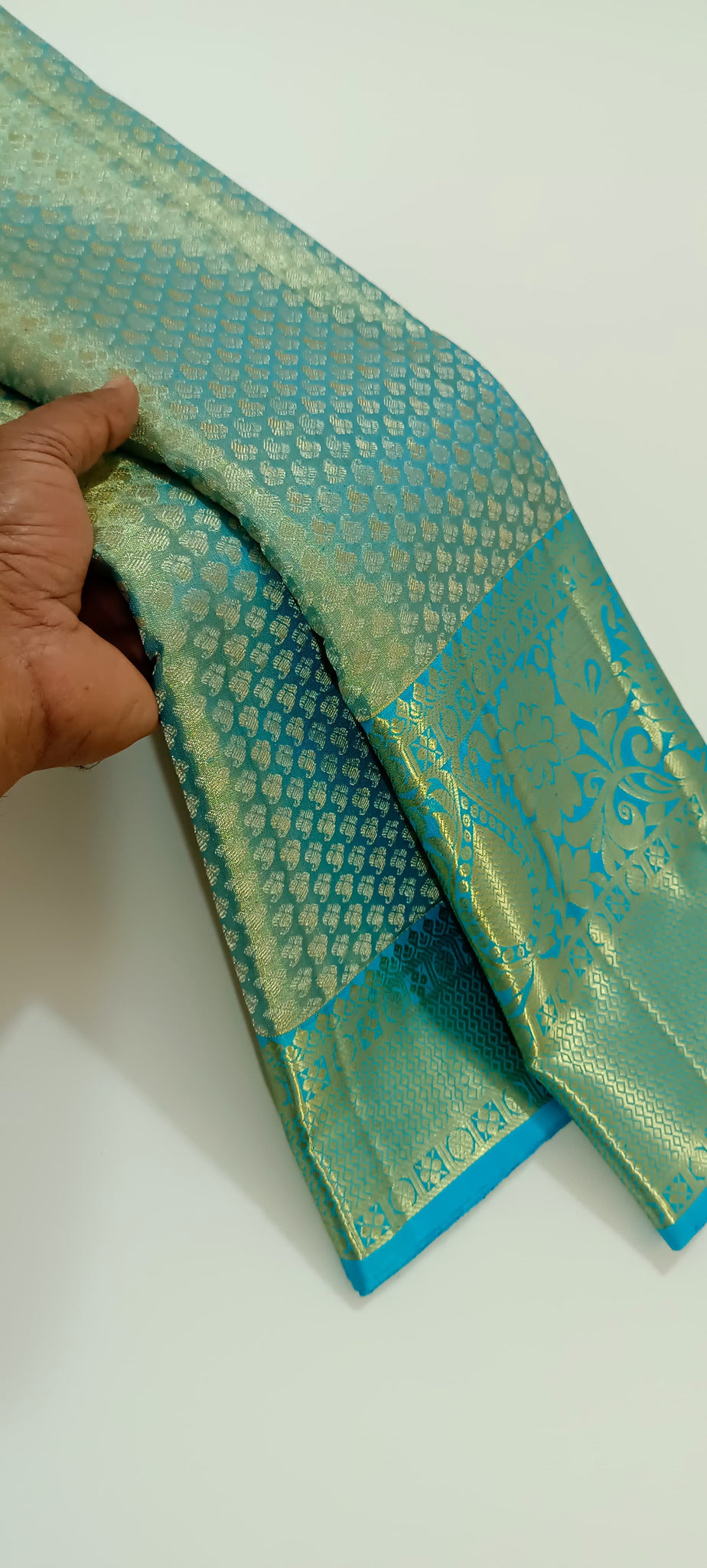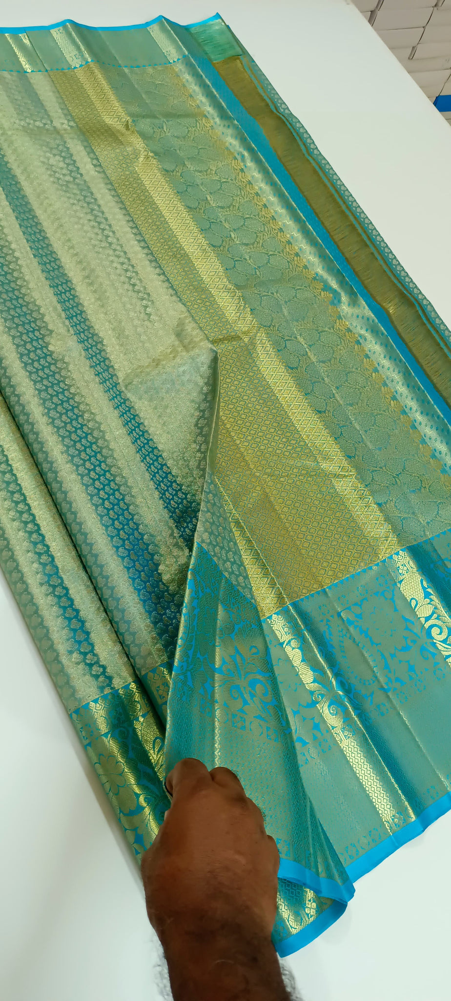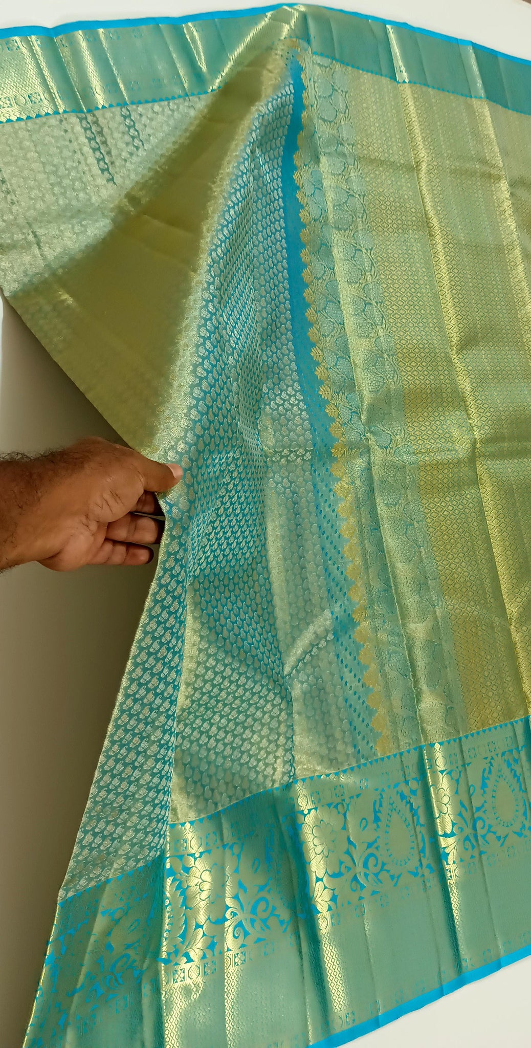 Gold zari warp, silver Zari crossed, with Water Blue Silk (multi Shades looking).
