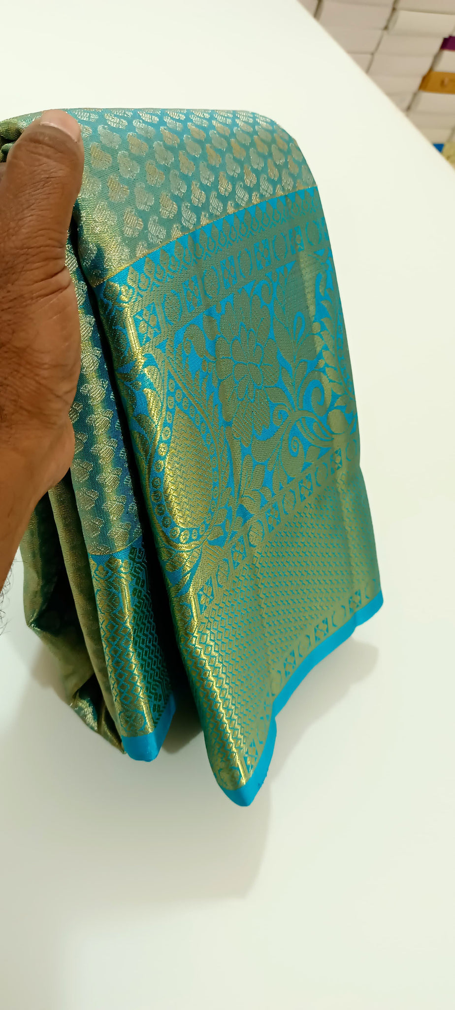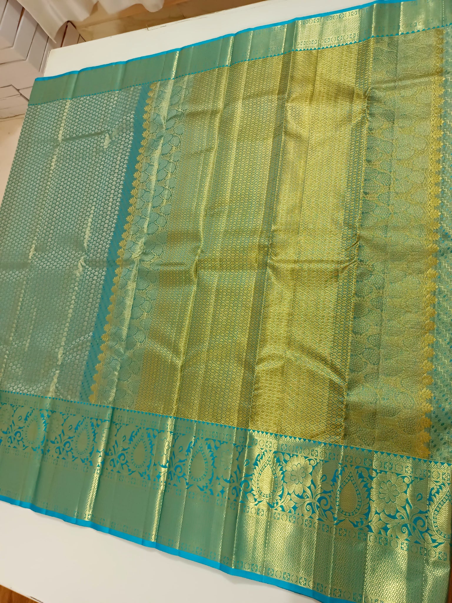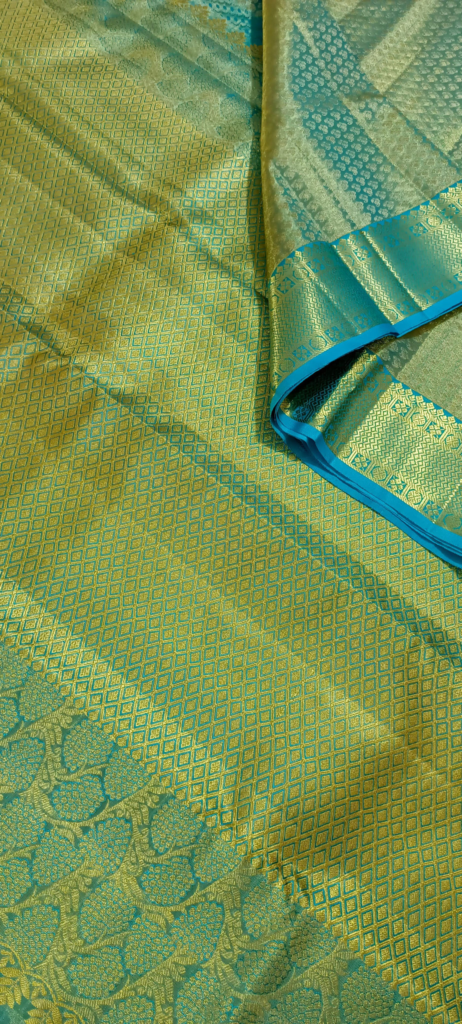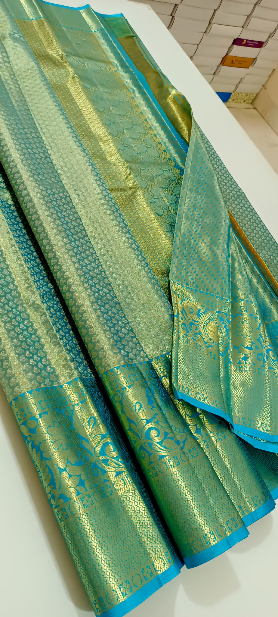 Gold zari warp, silver Zari crossed, with Water Blue Silk (multi Shades looking).