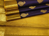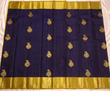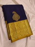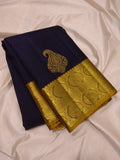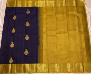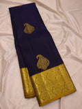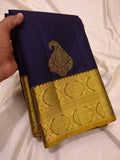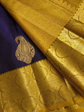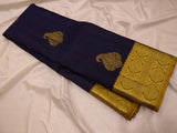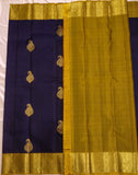 Indulge in the beauty of tradition with Ranganayaki's Kanchipuram Handwoven Classic Silk Saree. Adorned with a Rich pallu and stunning traditional borders, this saree features a Navy Blue body and a Golden Pallu with Chocolate accents. Made from pure silk and certified with a silk mark tag hologram.