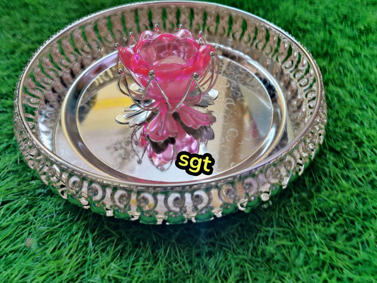 Amala, elegant German silver washable Tray with Pink Candle stand-SILVA001CS