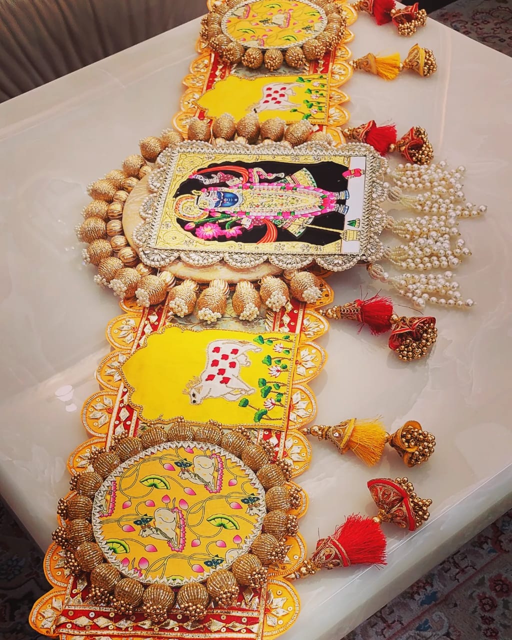 This Tanjore Hand Painted Bandhanwar is perfect for adding a festive touch to your celebrations. Decorated with a stunning Shree Nathji design, its intricate hand-painted craftsmanship creates a truly breathtaking effect. Enhance your special occasions with this piece of art today.
