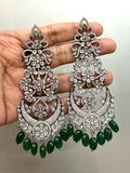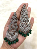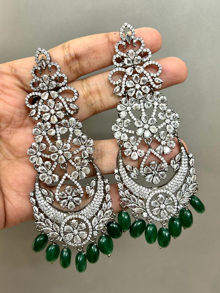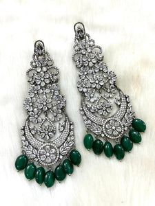 Anarkali Green , Zircon Diamond Long earrings in Victorian Black finish With Green Beads Hanging with back clip support-SANDY001