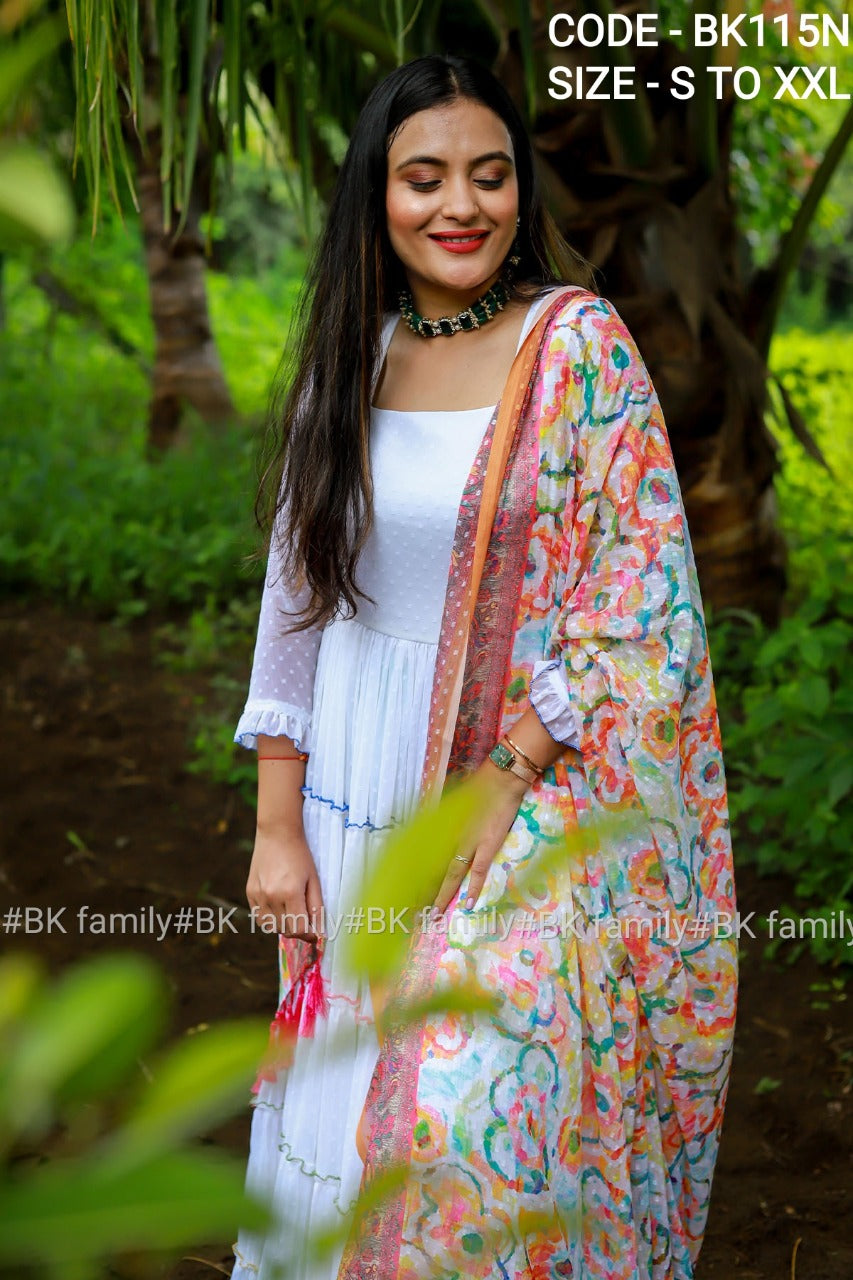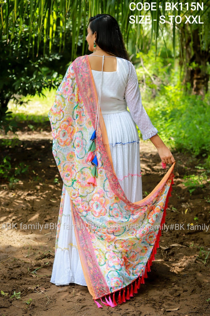 Rang Barsee Dress If you are looking for an outfit to be worn during a festival or to a wedding or even a birthday party with your loved ones, then our Fleur Butti chiffon Tier Dress is definitely the one. The come with gorgeous floral print Duppatta with pink tassels, The classy 12 mtr flares, and the super-light chiffon material will surely make you the happiest person in the room!