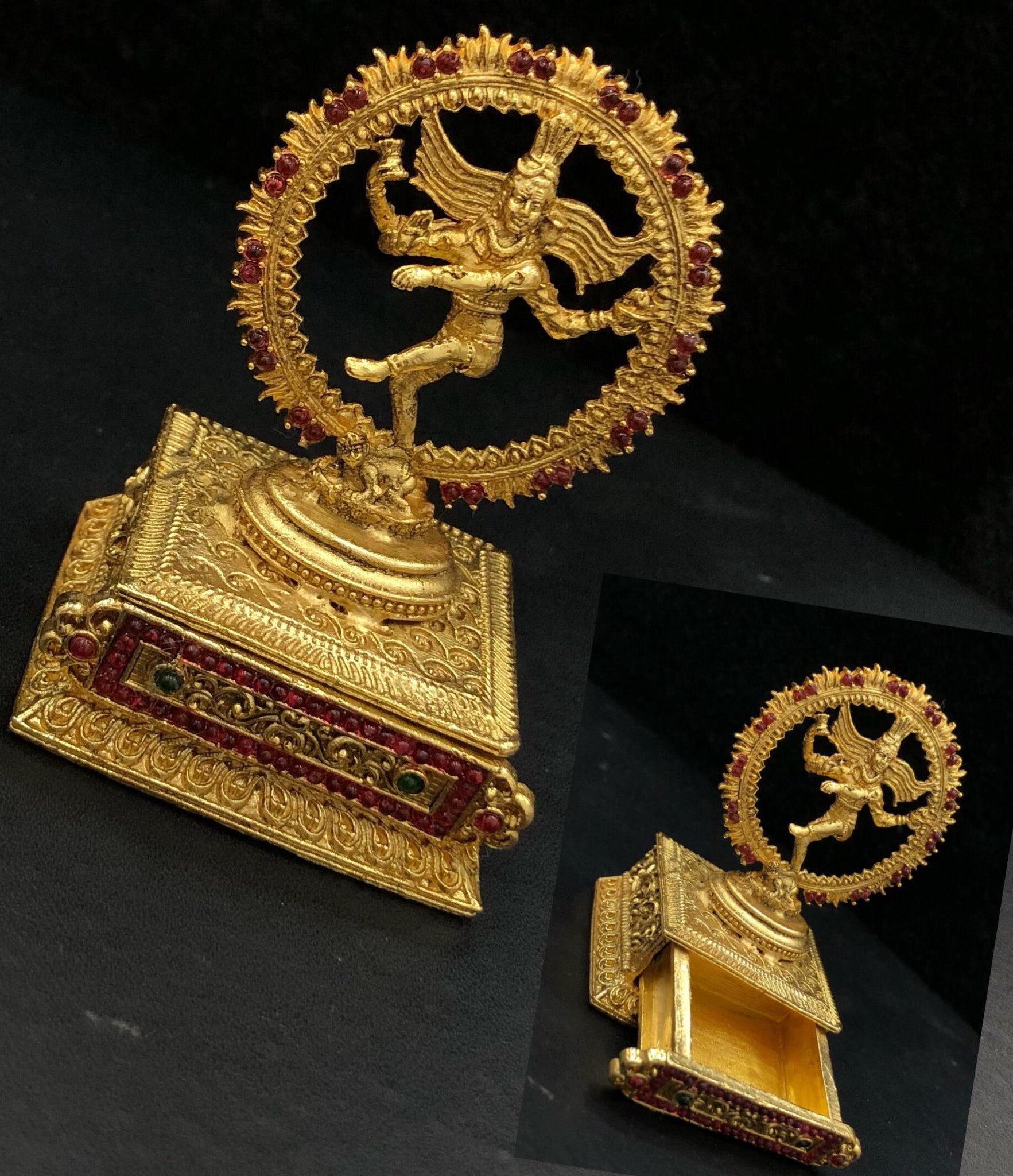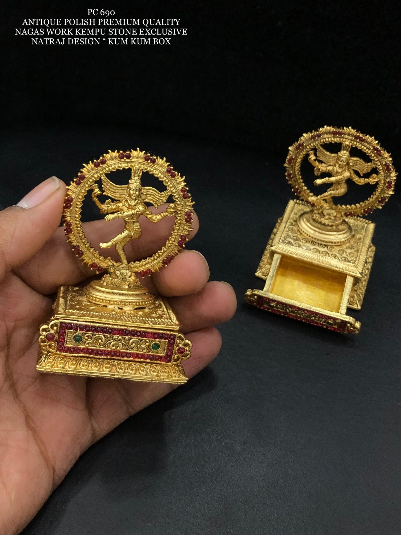 Learn about traditional Indian culture with the Golden Nataraja  antique gold finish Kumkum Dabbi for women. This beautiful dabbi features engravings of Natraj , along with intricate pink kemp stone work. Give as a thoughtful gift or use for Return Gifts for weddings and Poojas.