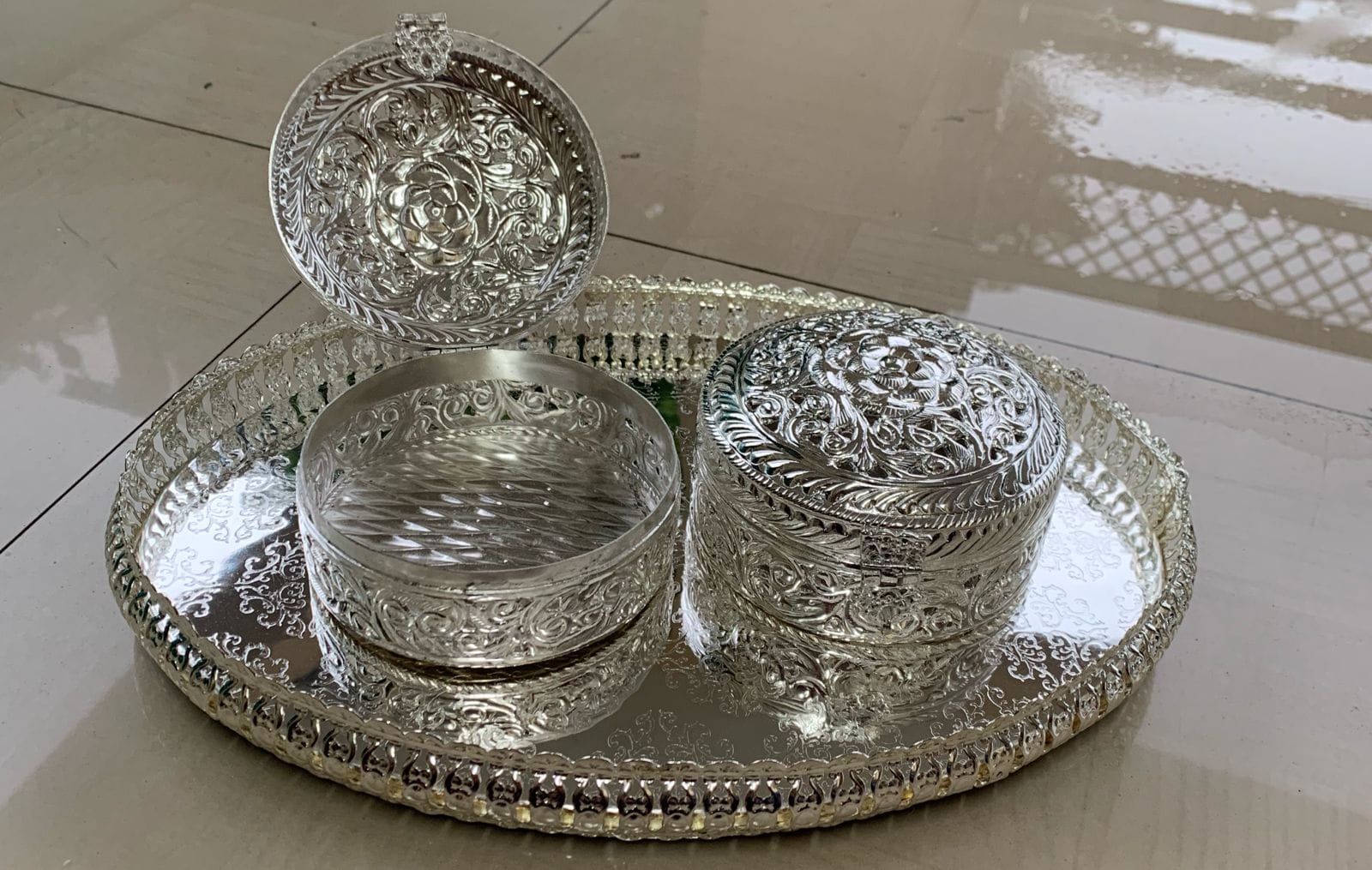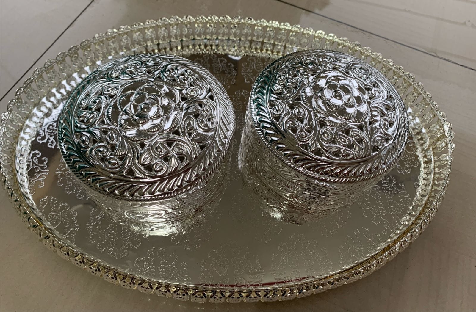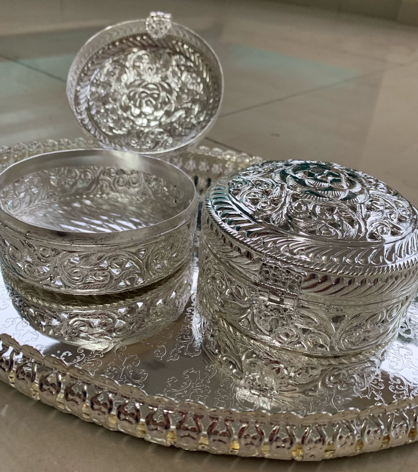 GERMAN SILVER DESIGNER OVAL TRAY WITH TWO ROUND BOXES -ANUBGSTB001