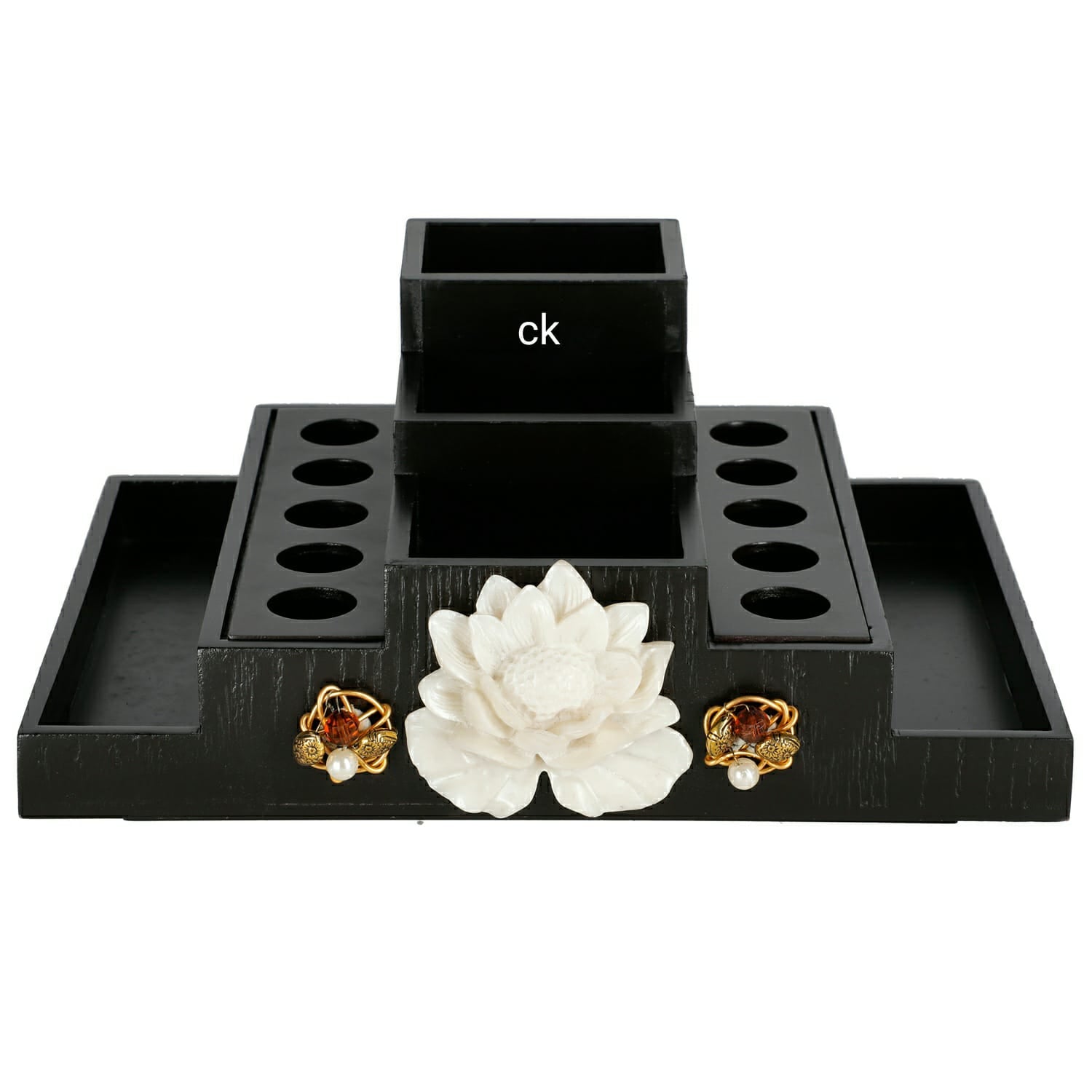 Step dresser with 3 holders for your combs, Brushes , eyepencils and mascaras. Flanked on 2 side by sections for lipsticks and Nailpolish