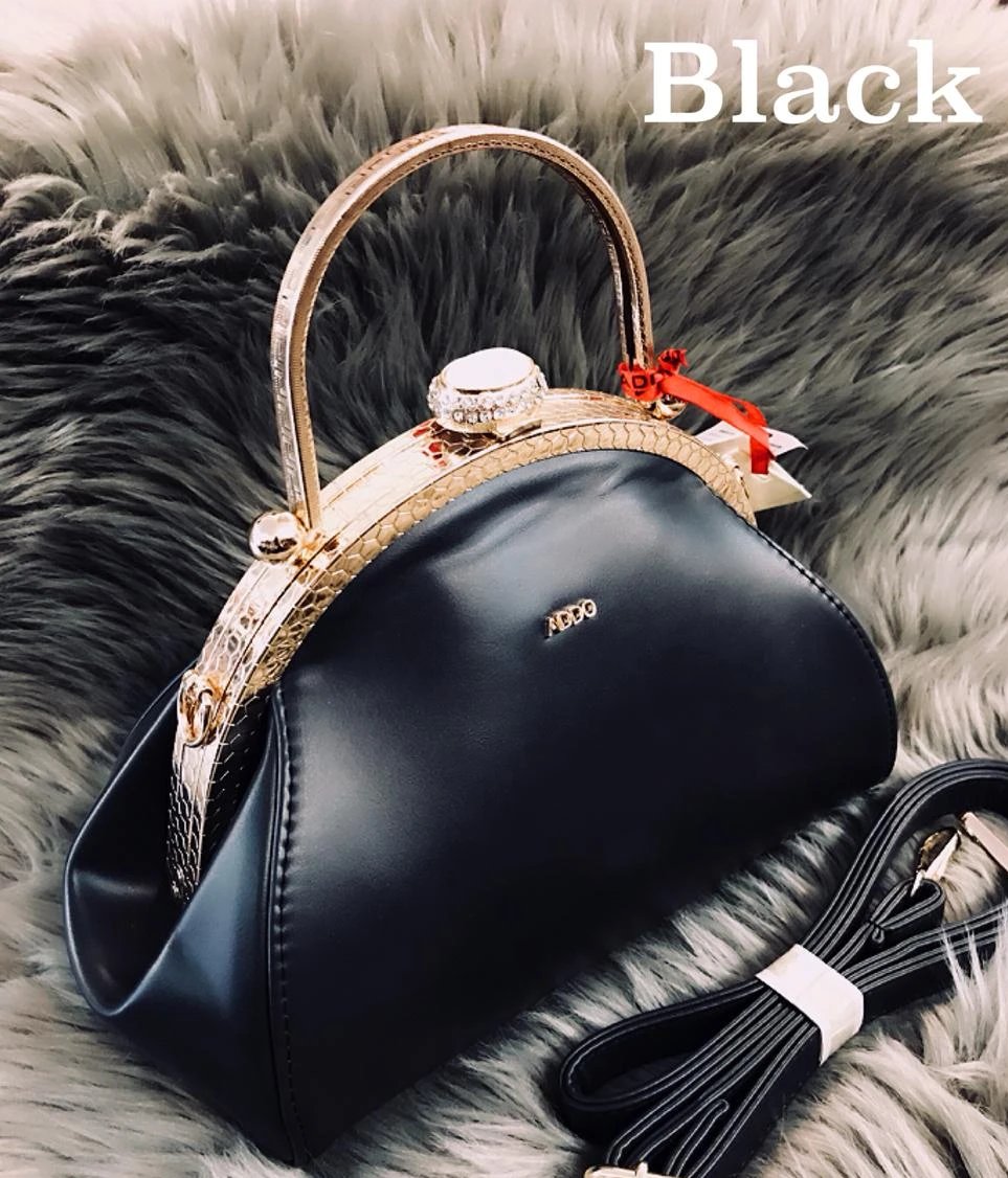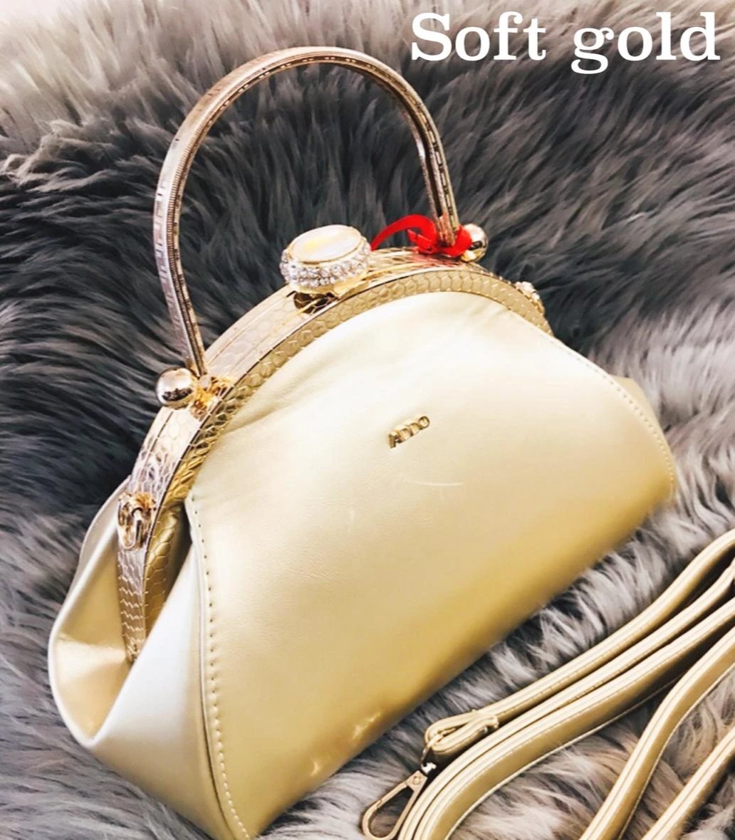 - Women's Gold frame Handbags with solid gold handle in superior quality pu leather to give you an elegant look comes with a long detachable gold sling belt .Size of bag is 8 x 10 inches.