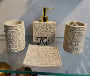 Organize the Bath with this Designer Bathroom accessory set which comes with a soap dispenser, a tumbler and a soap dish. The tumbler can be used to keep toothbrushes, toothpastes or even shaving accessories. This Designer Bathroom Set adds finesse to the set and elegance to any bathroom setting. The set can also be used for gifting purposes.