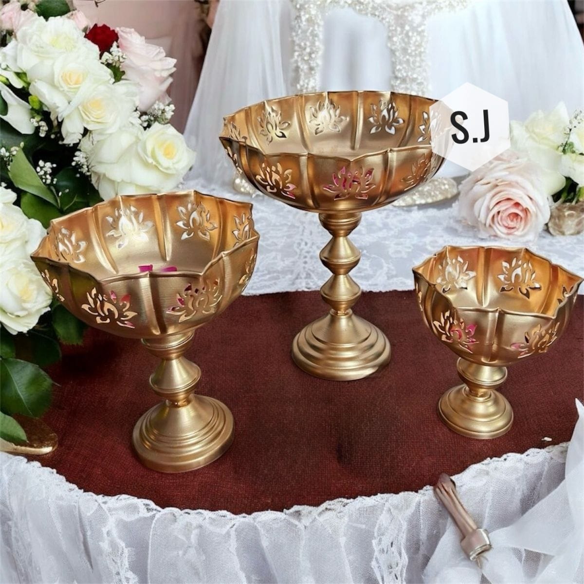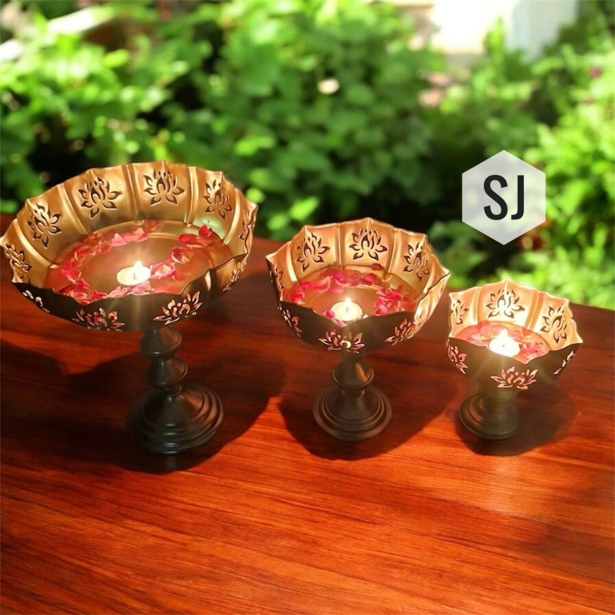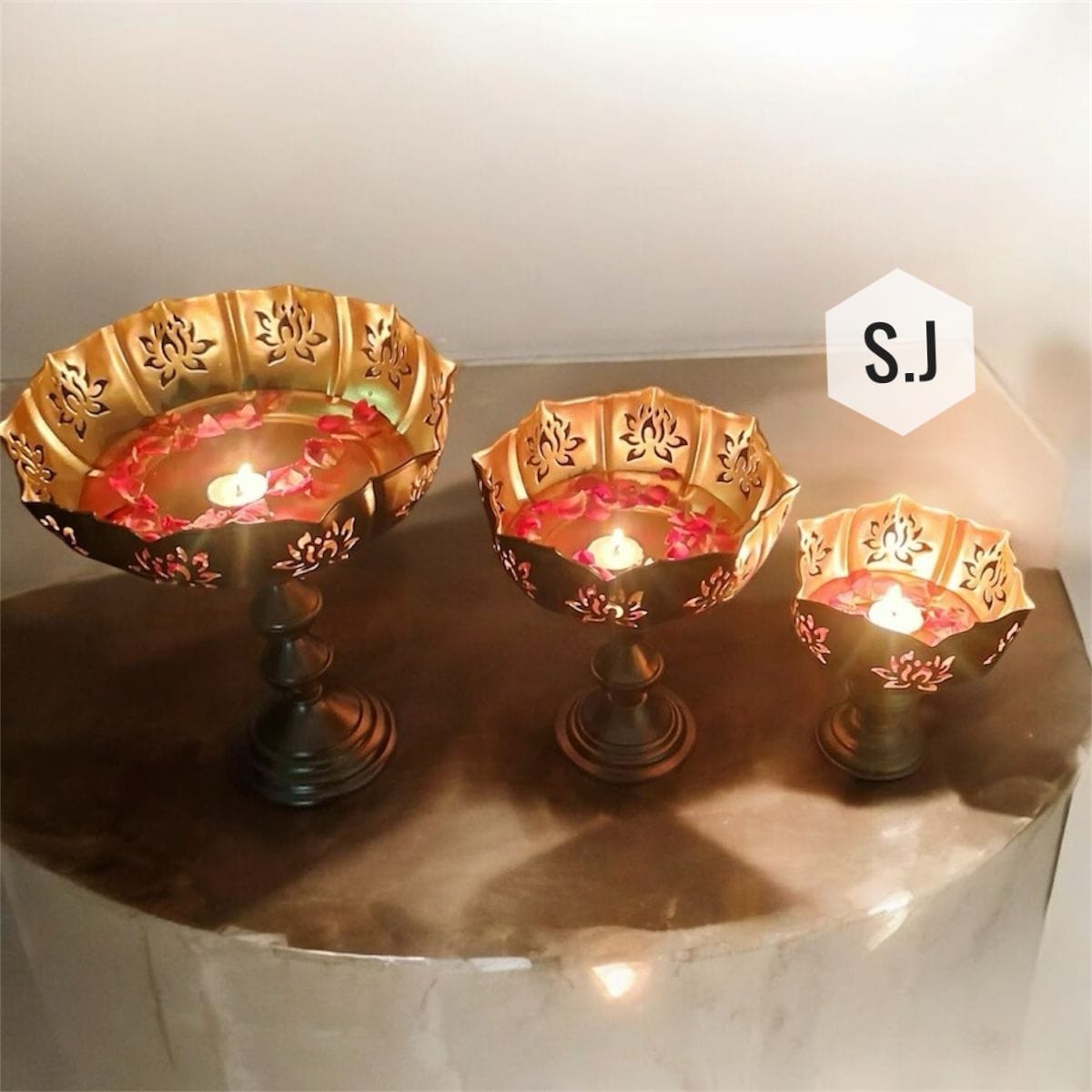This exquisite combo features three Urlis adorned with elegant lotus flower etched designs, paired with matching pillar stands. Crafted to enhance any décor, these Urlis serve as sophisticated centerpieces that blend traditional artistry with contemporary style. Ideal for festive occasions or everyday elegance, they offer a refined way to display floating candles or flowers, creating a serene and inviting ambiance.