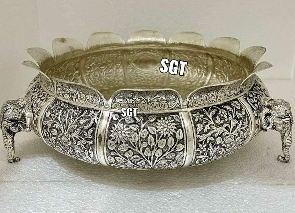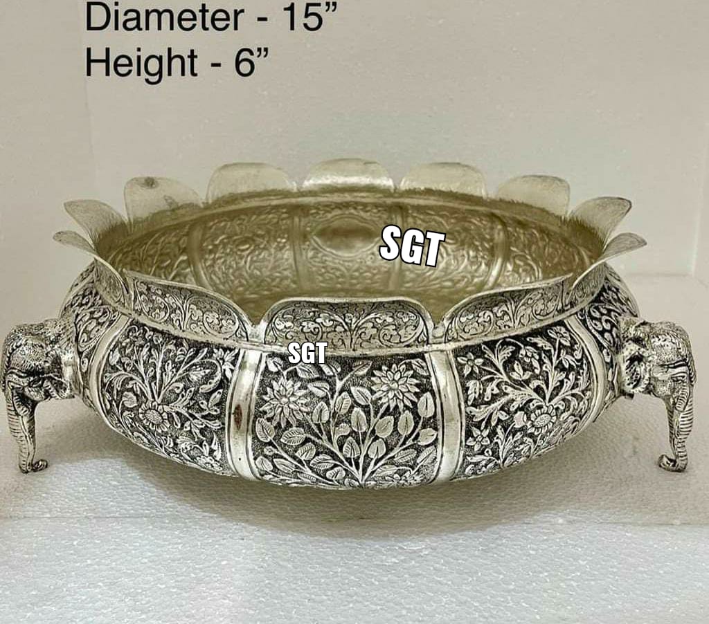 Antique German Silver washable Flower shaped Urli with Elephant  Design Legs