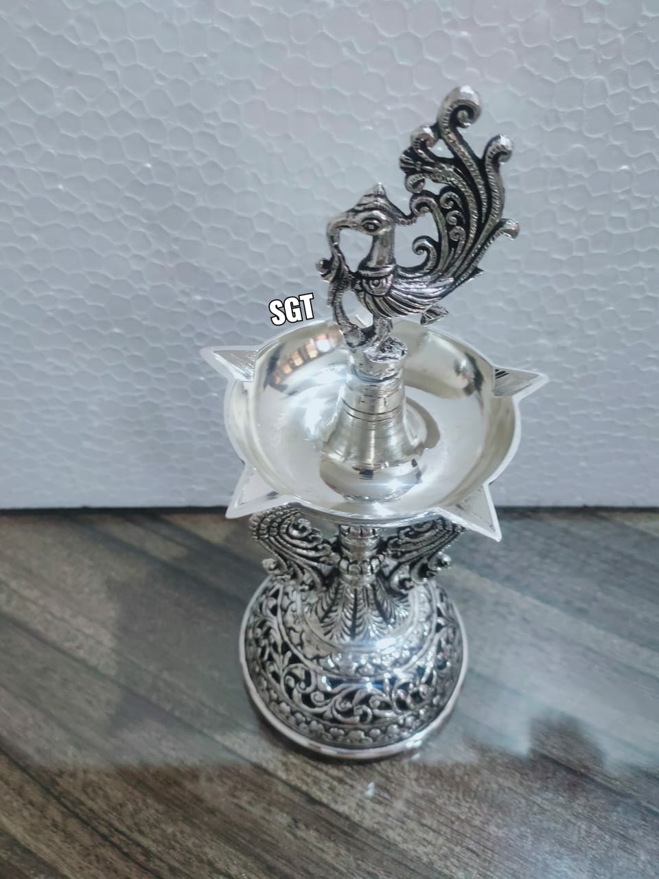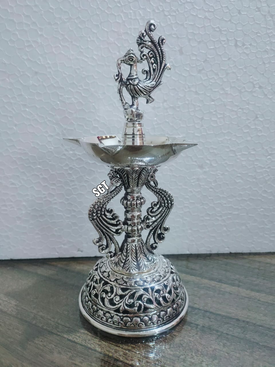 MAYURDEEP , PURE SILVER PLATED ANTIQUE GERMAN SILVER FINISH PAIR OF 2 PEACOCK LAMPS FOR DIWALI -SNPLD001
