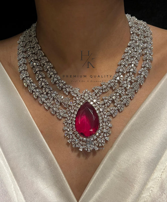 Anona , Platinum Finish Red stone studded Diamond Replica Necklace Set for Women -JAID001RS