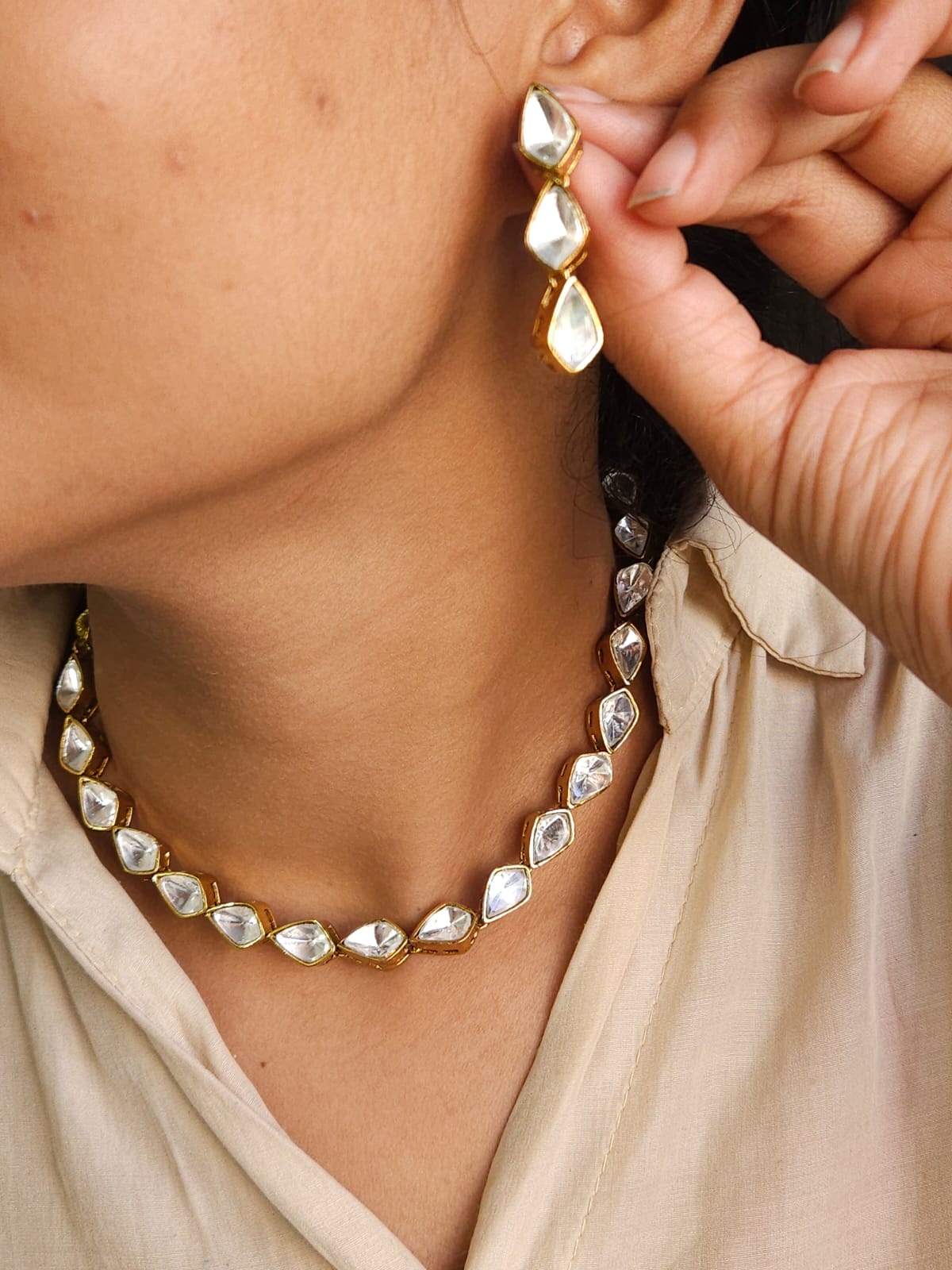 Discover elegance and sophistication with our Muskan , Polki [Back side silver foiled] necklace set for women . Made with back side silver foiling, this set exudes high-quality craftsmanship and a touch of classic aesthetic. Perfect for any occasion, this necklace set will elevate your look and make you the center of attention.