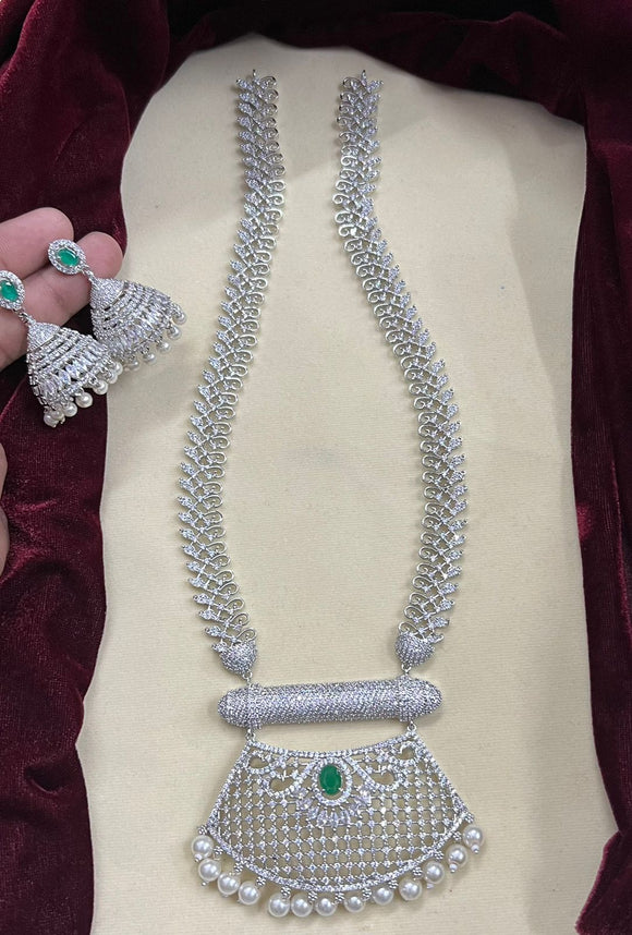 Mamta, elegant Platinum finish Diamond replica Long Necklace set for women - MOE001LNSM