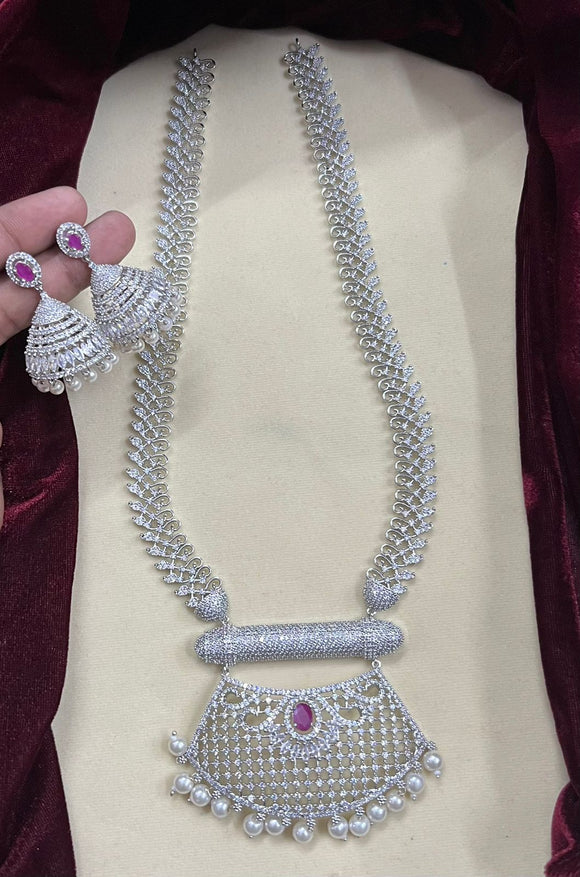 SURUMI, PLATINUM FINISH AMERCIAN DIAMOND LONG NECKLACE SET FOR WOMEN -LRLNS001SU