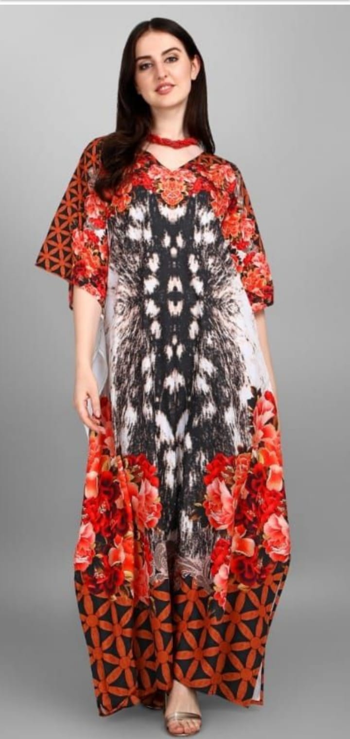 Weaved in premium quality Polyester Crepe fabric, these kaftans have extraordinary lustrous, opaque and soft texture. Its beautiful silhouette and great fall is enhanced by the Premium digital printing on it with unique designs with stone work. With a length of 58 inches and a drawstring at the waist, it empowers you to customize it to fit you perfectly. This season, grab this absolute comfortable wear and stay versatile!!