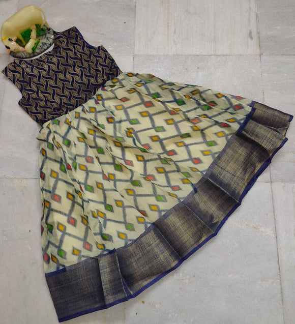 GREY SOFT BAGALPURI IKAT PRINT AND BANARASI JACQUARD COMBINATION FROCKS FOR GIRLS-SAYDBF001GRY