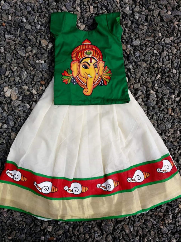 GREEN GANESHA MURAL DESIGN BLOUSE & SHANKU DESIGN PATTU PAVADA SET FOR GIRLS-CFRMPPG0017