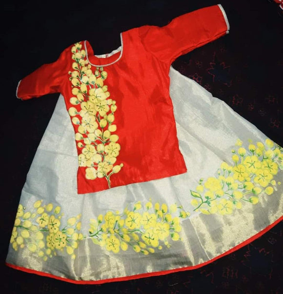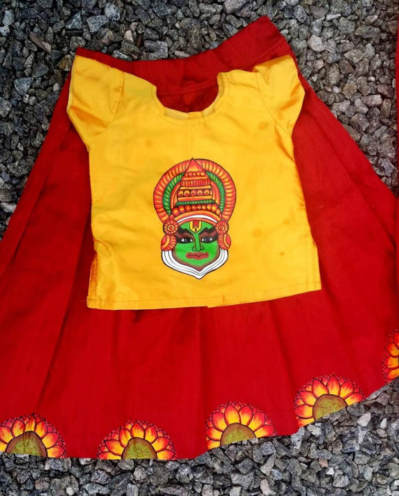 YELLOW KATHAKALI MURAL DESIGN BLOUSE & RED PATTU PAVADA SET FOR GIRLS-CFRMPPG0015