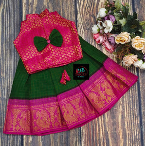 MAGENTA AND GREEN SANGUDI COTTON SKIRT WITH BROCADE TOP AND BOW -SRI001SSBMG