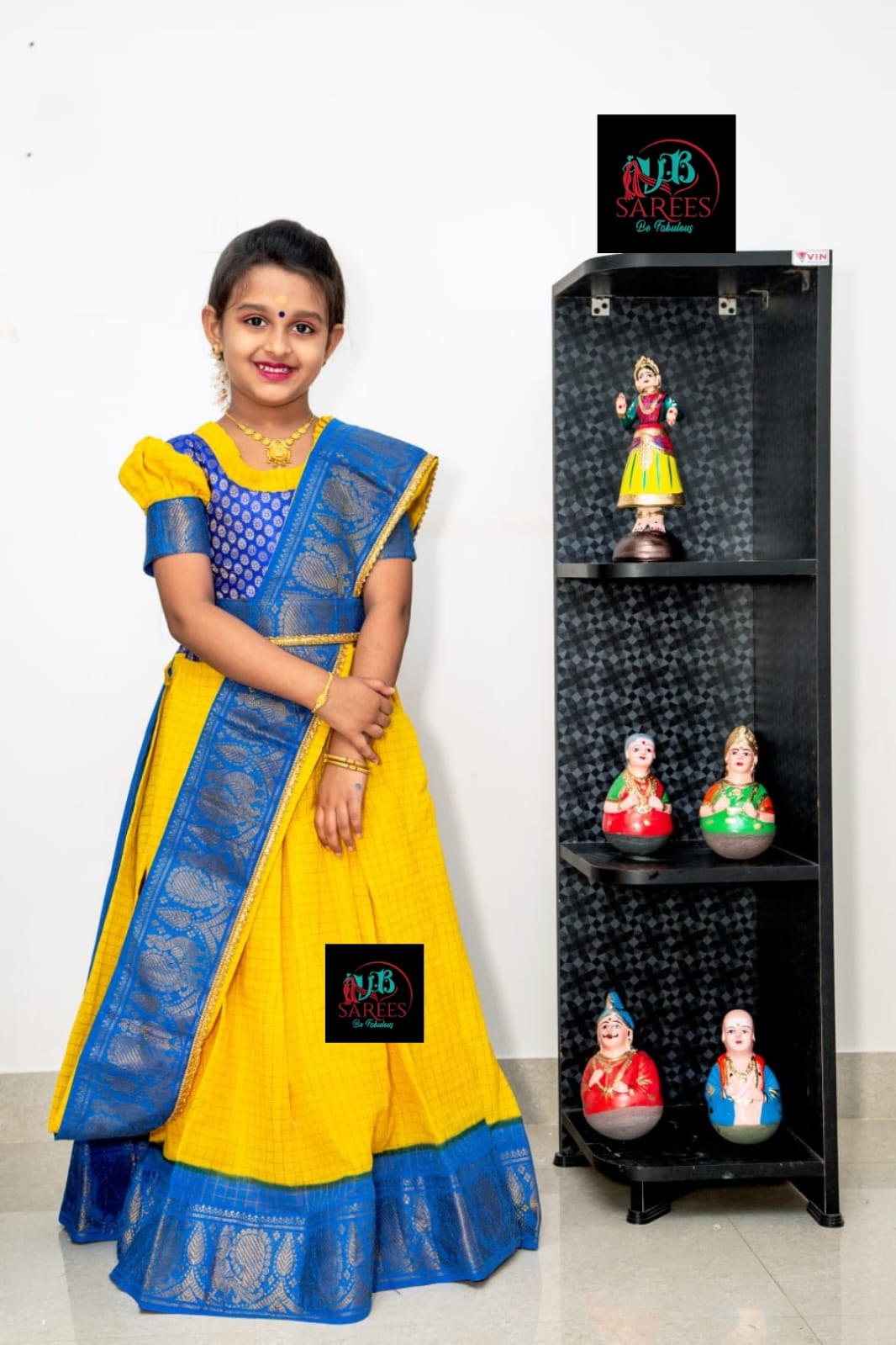 Sungudi Cotton Readymade Saree Paired with Brocade Blouse with Hip Belt For Kids-SRI001MSYB