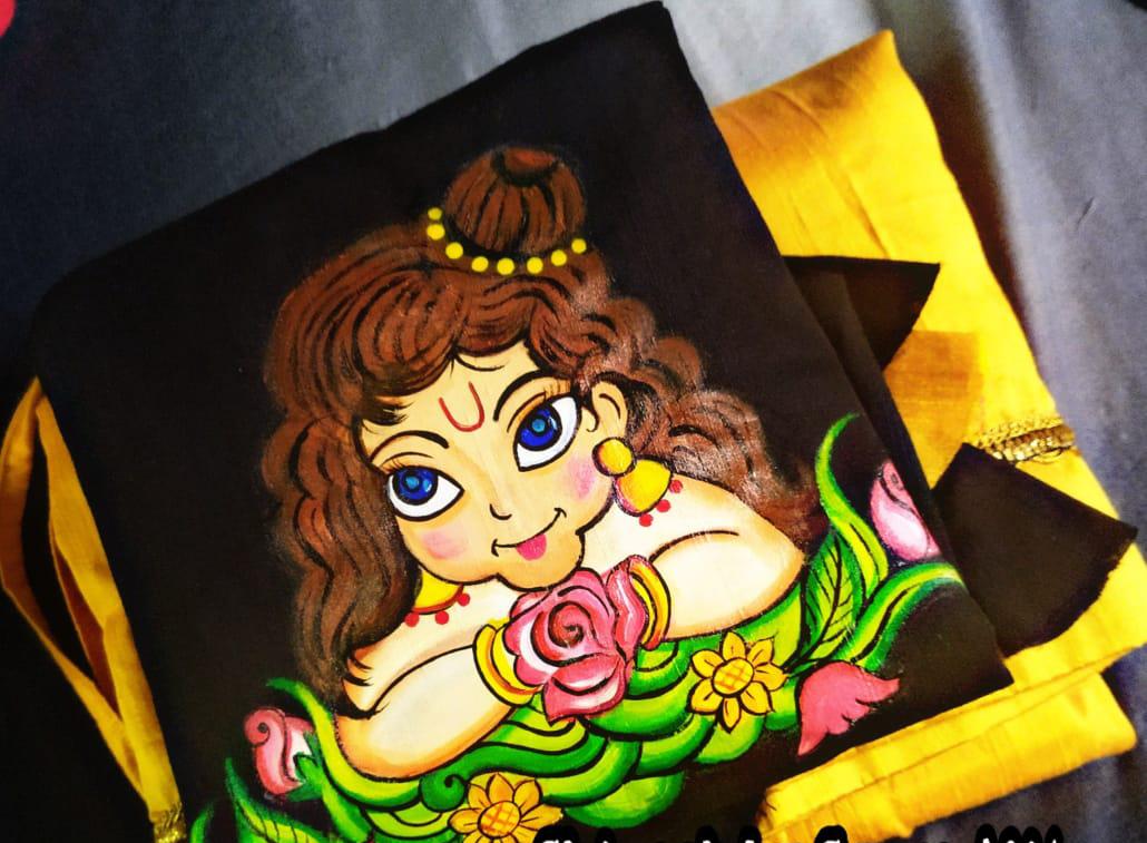 Cute Little Krishna Mural Design on Black Blouse with Golden Yellow pattupavada for girls.