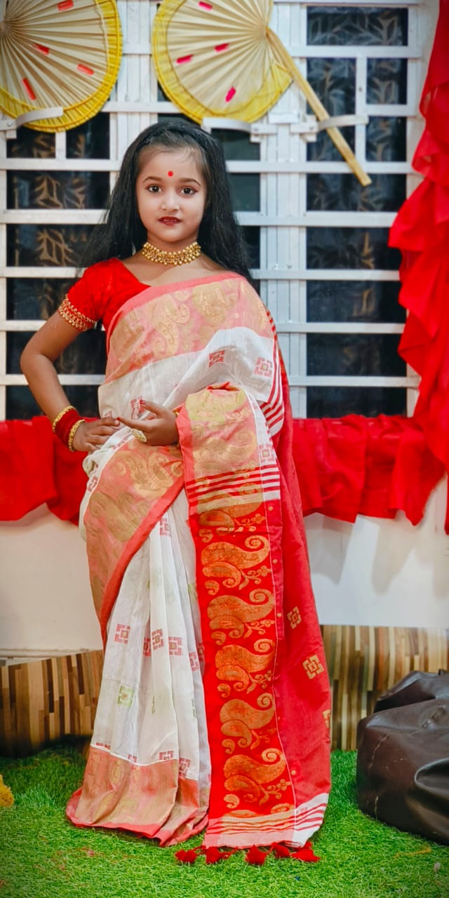 Red and White color combination Saraswati Puja Special Aam Kalka Design Saree for Kids-AMAZ001KSA