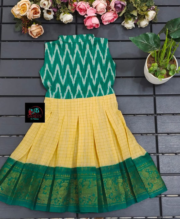 YELLOW AND GREEN SHADE DESIGNER SUNGUDI FROCK WITH IKAT FUSION -SRI001ISFYG