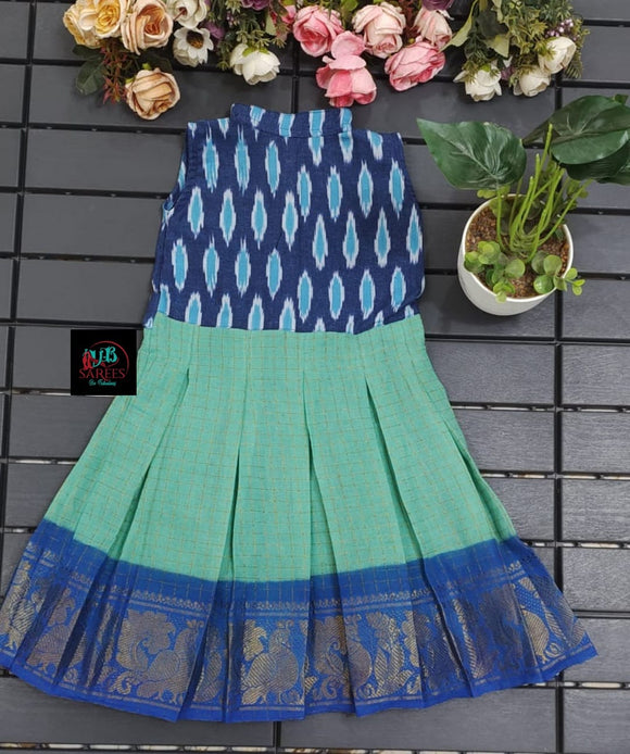 BLUE AND LIGHT BLUE SHADE DESIGNER SUNGUDI FROCK WITH IKAT FUSION -SRI001ISFBLB