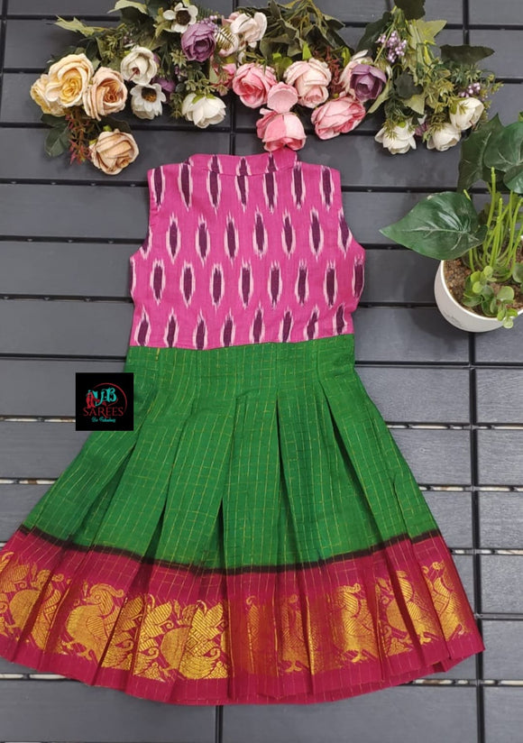 PINK AND GREEN SHADE DESIGNER SUNGUDI FROCK WITH IKAT FUSION -SRI001ISFPG