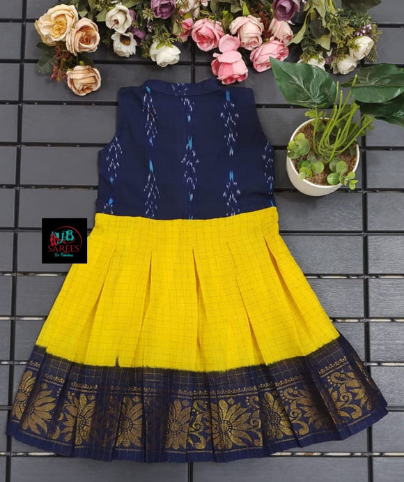 YELLOW AND BLUE SHADE DESIGNER SUNGUDI FROCK WITH IKAT FUSION -SRI001ISFYB