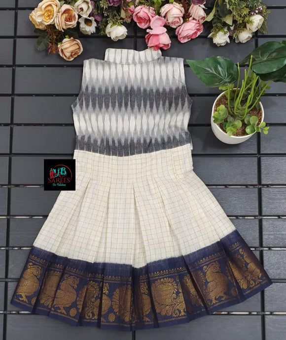 WHITE SHADE DESIGNER SUNGUDI FROCK WITH IKAT FUSION -SRI001ISFW