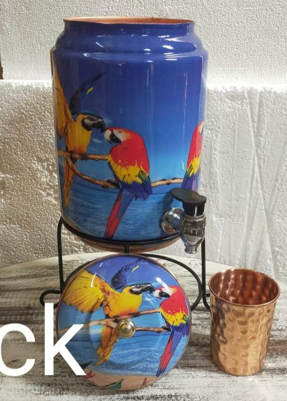 HAPPY BIRDS,ENAMELLED PRINTED 5 LITRES COPPER WATER DISPENSER TANK WITH COPPER GLASS-SSHDCT001HB