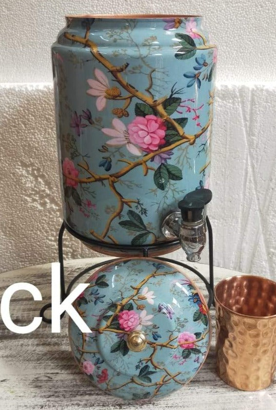 Blue floral enamelled 5 litres copper water dispenser with Glass -ANUB001WD