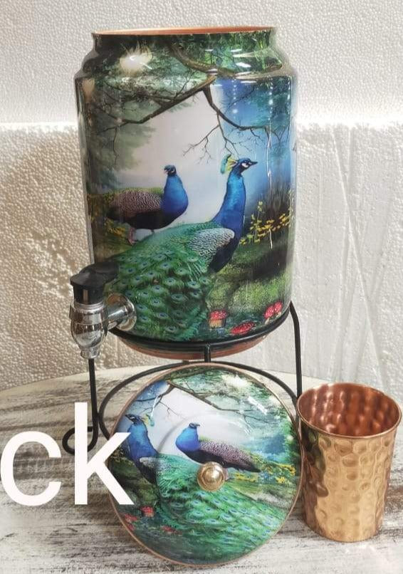 PEACOCK DESIGN ,ENAMELLED PRINTED 5 LITRES COPPER WATER DISPENSER TANK WITH COPPER GLASS-SSHDCT001PD