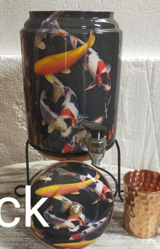 GOLD FISH DESIGN ,ENAMELLED PRINTED 5 LITRES COPPER WATER DISPENSER TANK WITH COPPER GLASS-SSHDCT001GF