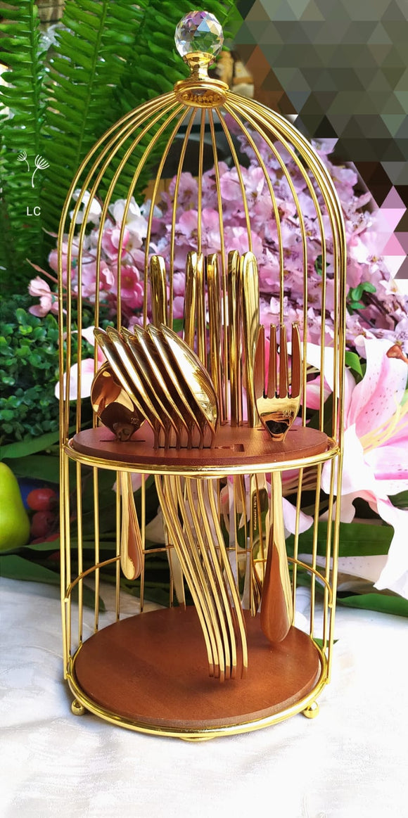 Elegant Golden Finish Cutlery Set with Stand-PRIYA001GS