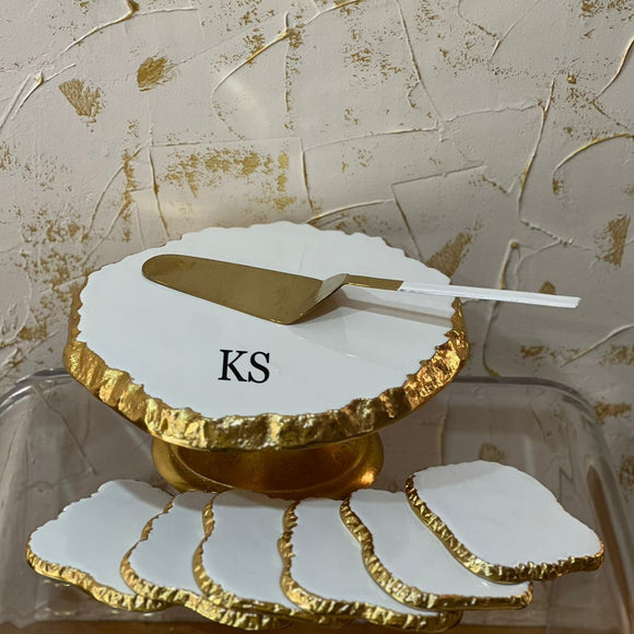 White Enamel Gold Cake Stand with Spatula and Coasters set of Six Pcs-PANI001CSW