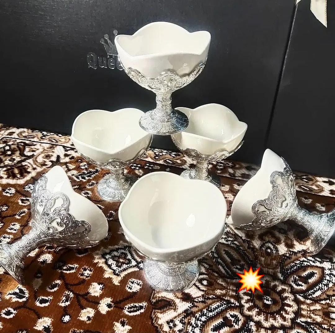 Beautiful footed porcelain dessert bowls with silver metal casing-AMAZE001PC