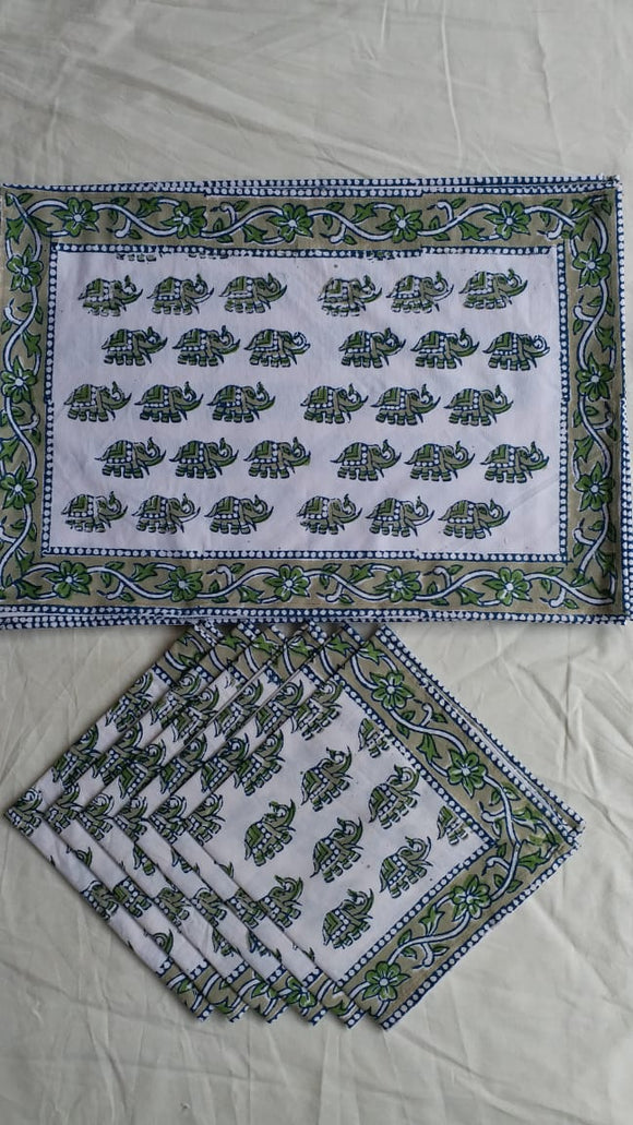 GREEN HATHI DESIGN HAND MADE BLOCK PRINT MAT AND NAPKIN (SET OF 12) pcs -RGM007