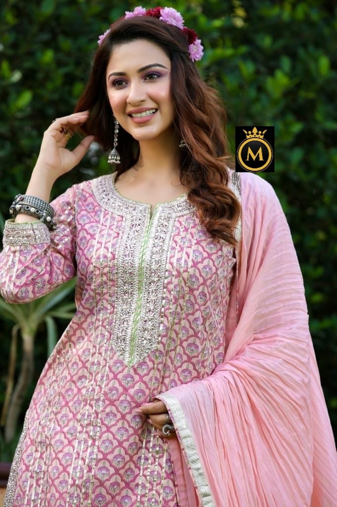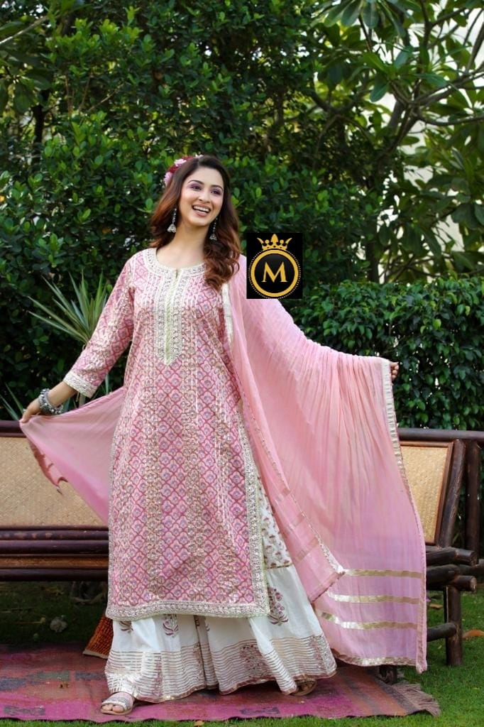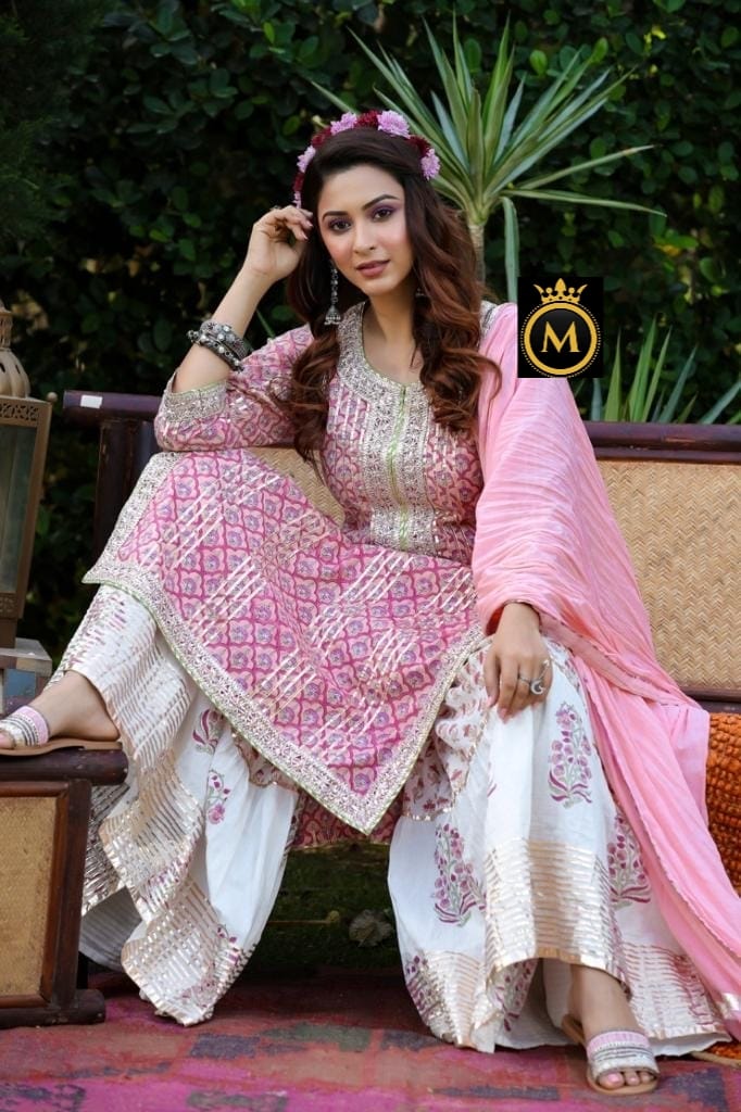 COTTON KURTI WITH GOTA DETAILING PAIRED WITH BEAUTIFUL SHARARA WITH GOTA WORK AND COTTON DUPATTA WITH LACE
