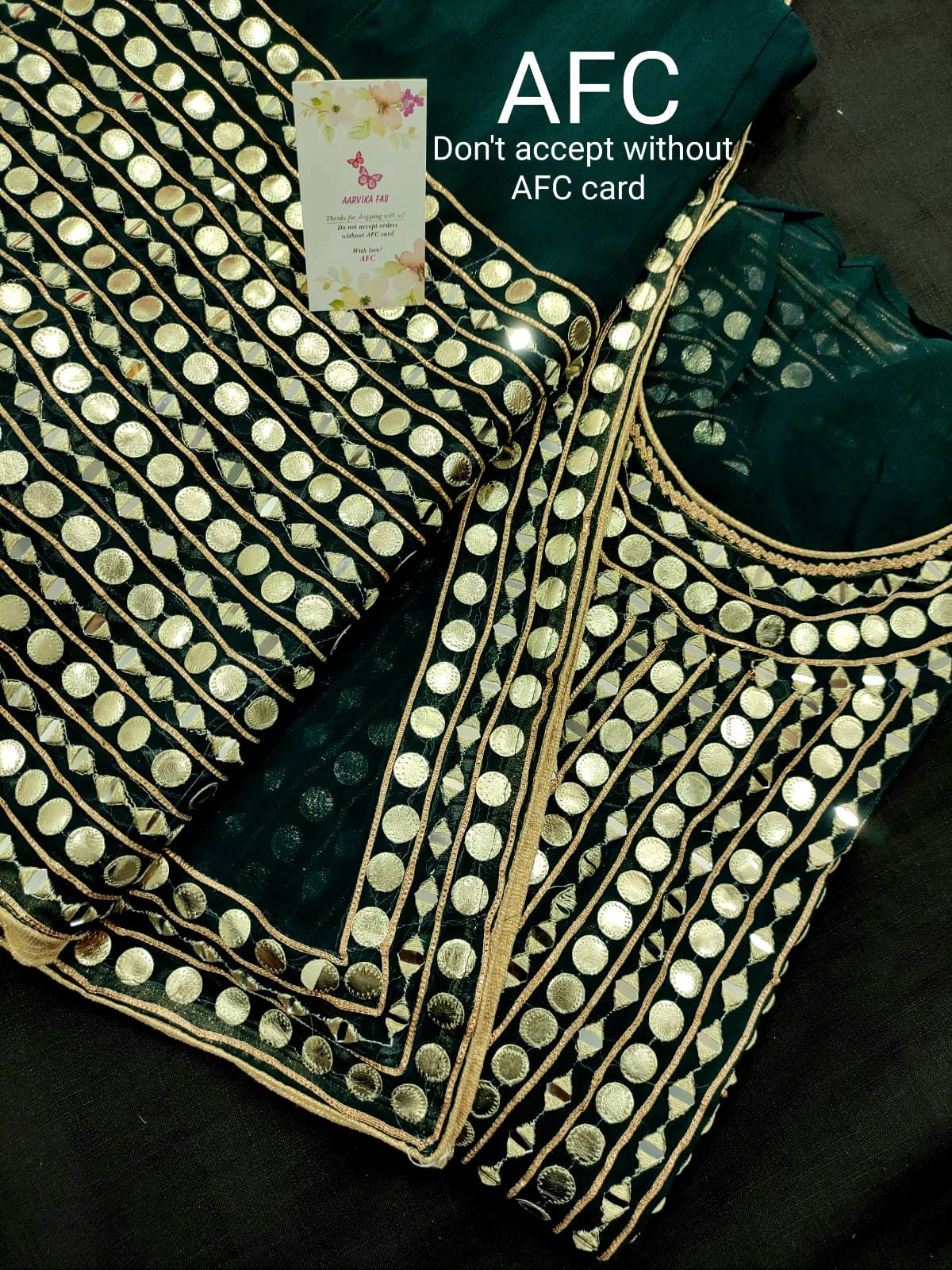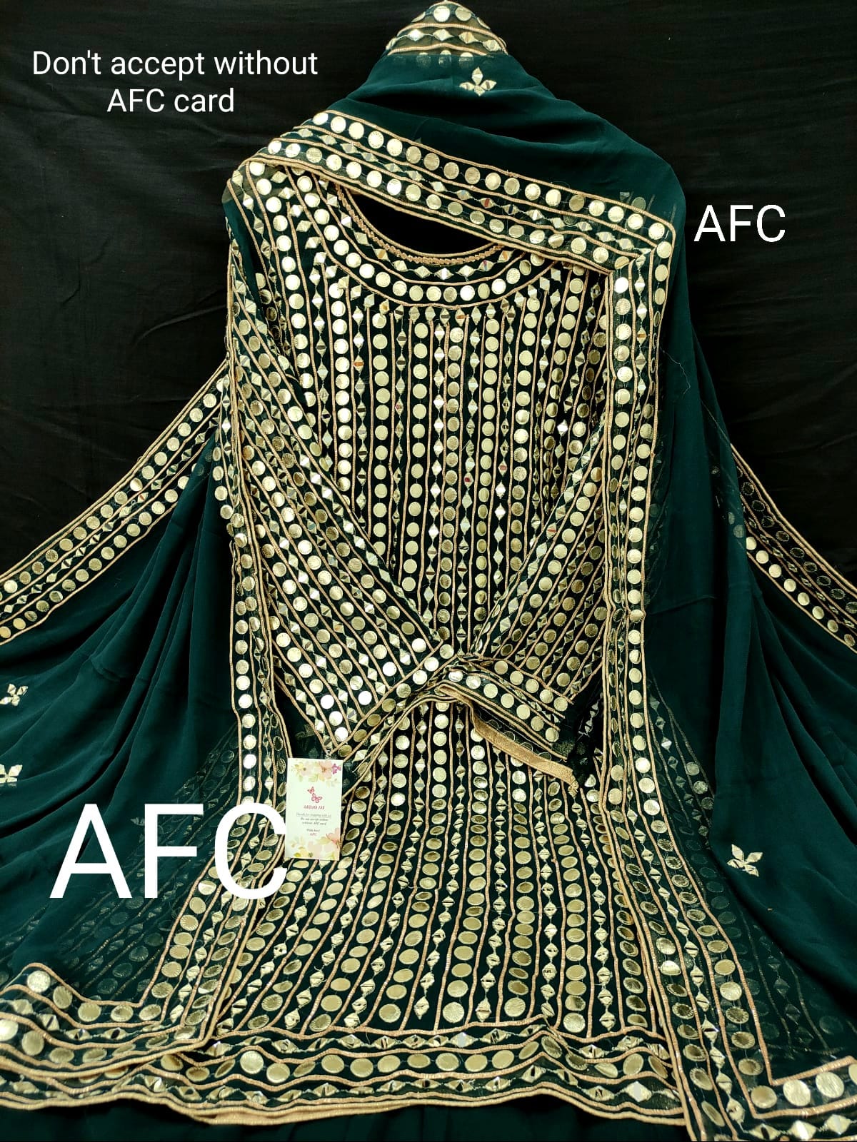 FESTIVE SPECIALTop:- Pure Georgette shirt with beautiful heavy mirror and premium quality soft leather embroidered work front fabric, sleeves and back neck with gotta neck, sleeves and ghera (semi stitched & width 50 and length 43)